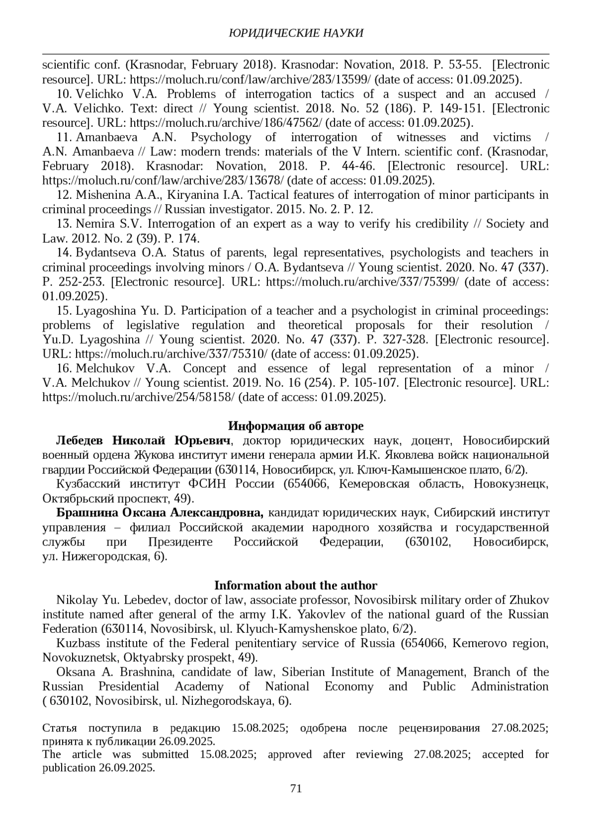 15. Лягошина Ю.Д. Участие педагога и психолога в уголовном процессе: проблемы законодательного регулирования и теоретические предложения по их разрешению / Ю.Д. Лягошина // Молодой ученый. 2020. № 47 (337). С. 327-328. [Электронный ресурс]. URL: https://moluch.ru/archive/337/75310/(дата обращения: 01.09.2025). EDN: CVJAJB