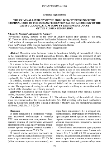 В статье отмечается актуальность проблематики уголовной ответственности мобилизованных граждан в современных условиях геополитической напряженности. Акцент поставлен на уголовно-правовой оценке поведения таких лиц в случае их отказа от выполнения приказа своего начальника в зоне проведения специальной военной операции.
