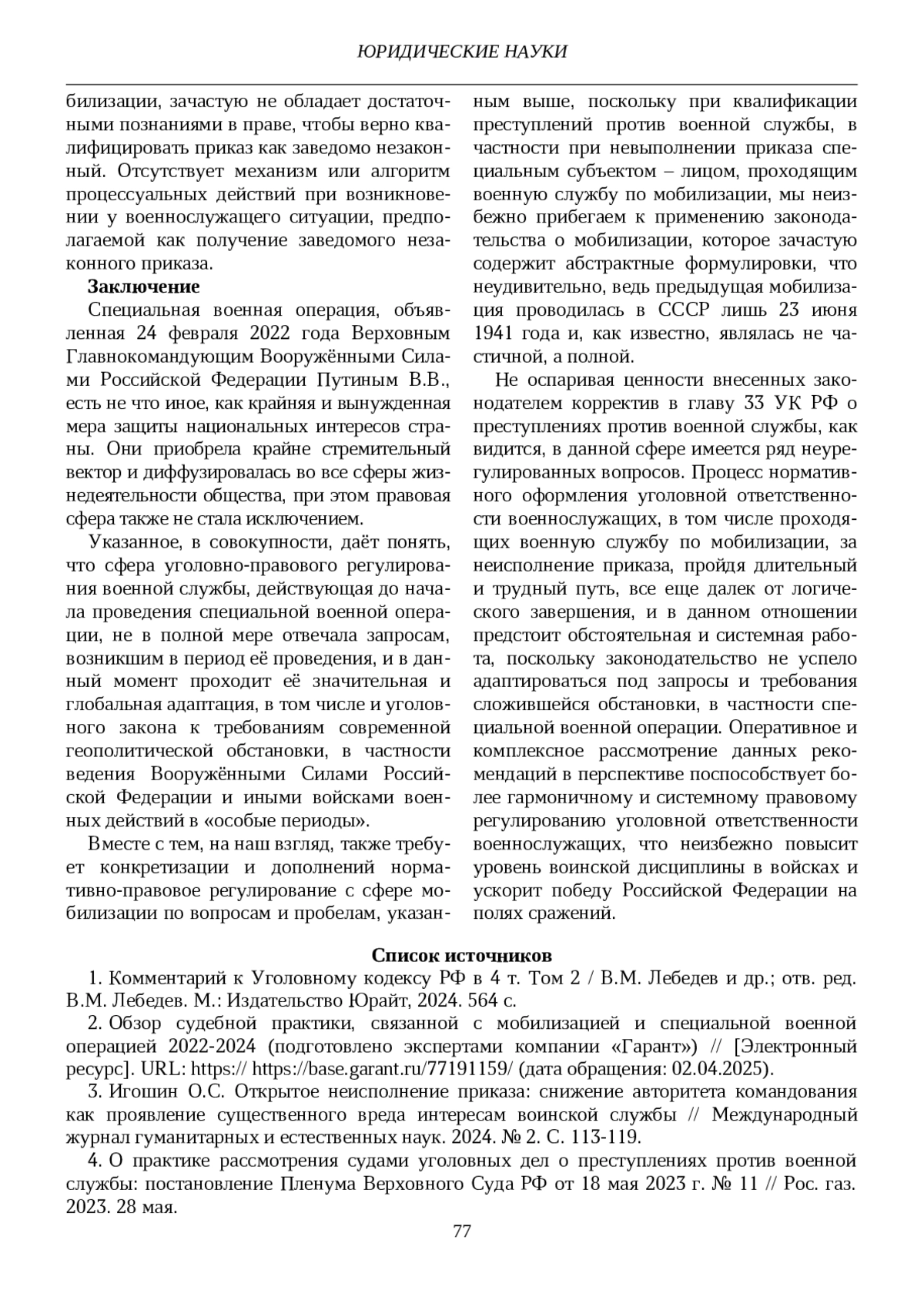 3. Игошин О.С. Открытое неисполнение приказа: снижение авторитета командования как проявление существенного вреда интересам воинской службы // Международный журнал гуманитарных и естественных наук. 2024. № 2. С. 113-119.