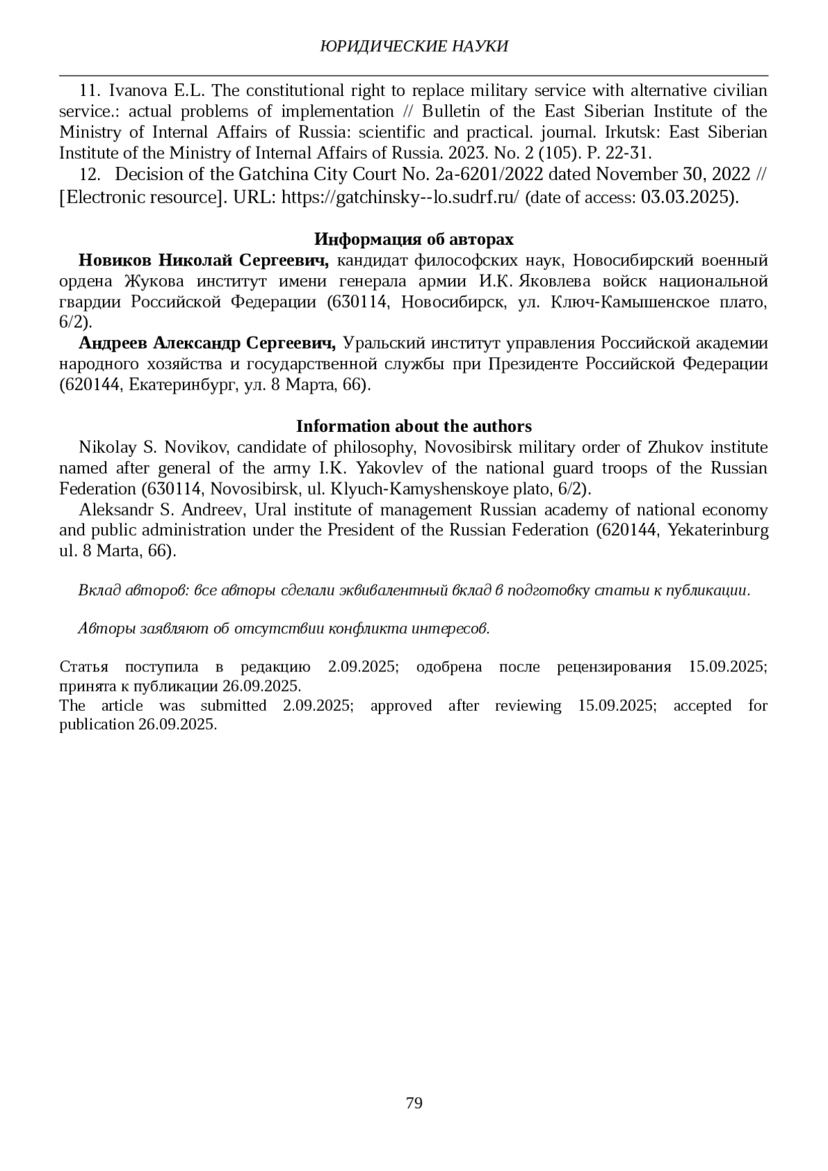11. Иванова Е.Л. Конституционное право на замену военной службы альтернативной гражданской службой: актуальные проблемы реализации // Вестник Восточно-Сибирского института МВД России: науч.-практ. журн. Иркутск: Восточно-Сибирский институт МВД России. 2023. № 2 (105). С. 22-31.