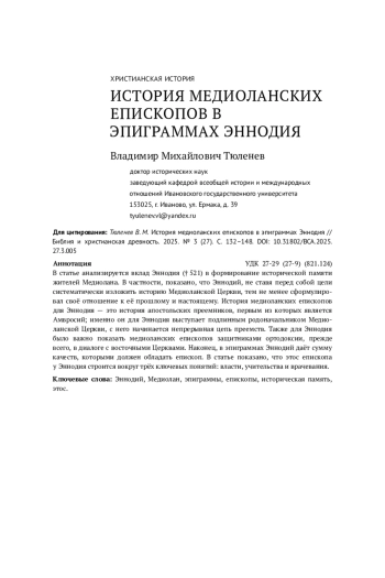 В статье анализируется вклад Эннодия († 521) в формирование исторической памяти жителей Медиолана. В частности, показано, что Эннодий, не ставя перед собой цели систематически изложить историю Медиоланской Церкви, тем не менее сформулировал своё отношение к её прошлому и настоящему. История медиоланских епископов для Эннодия - это история апостольских преемников, первым из которых является Амвросий; именно он для Эннодия выступает подлинным родоначальником Медиоланской Церкви, с него начинается непрерывная цепь преемств. Также для Эннодия было важно показать медиоланских епископов защитниками ортодоксии, прежде всего, в диалоге с восточными Церквами. Наконец, в эпиграммах Эннодий даёт сумму качеств, которыми должен обладать епископ. В статье показано, что этос епископа у Эннодия строится вокруг трёх ключевых понятий: власти, учительства и врачевания.