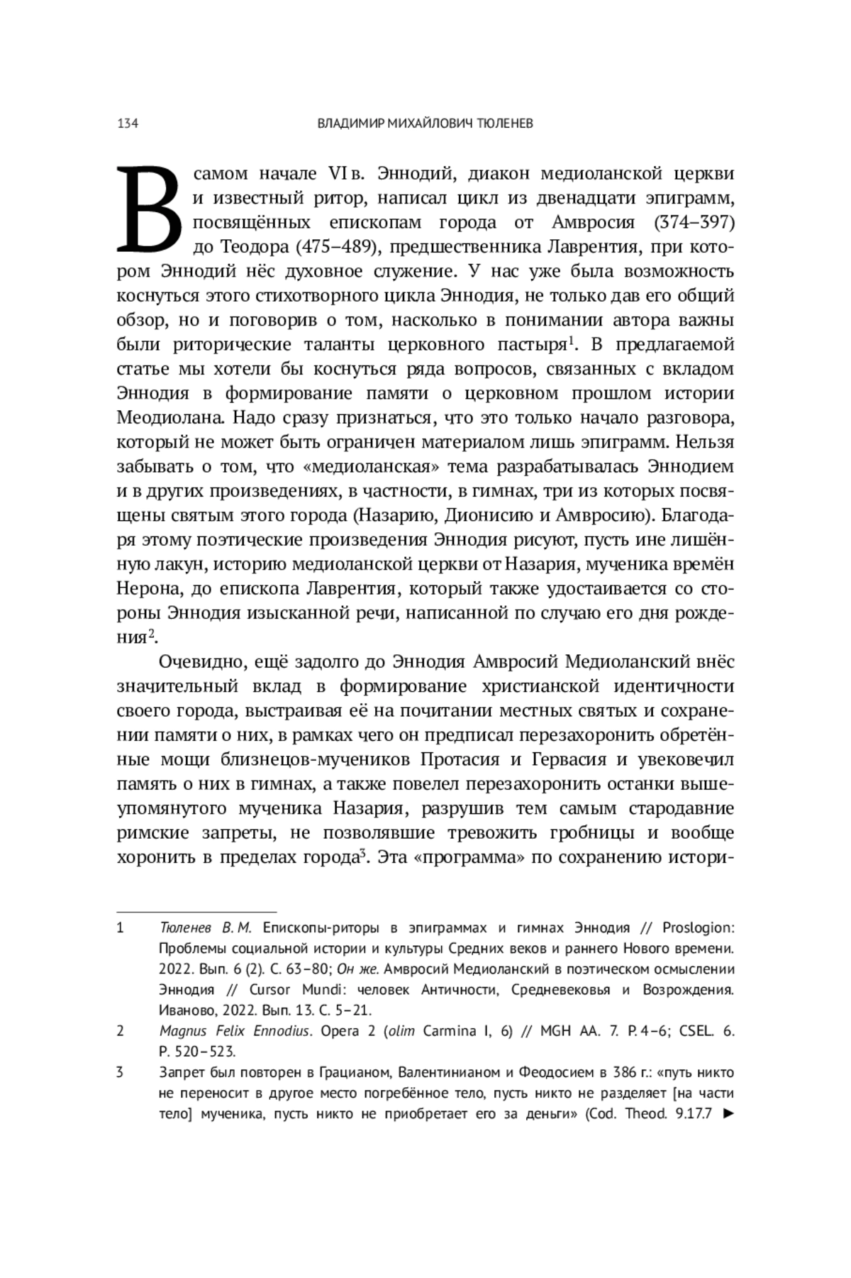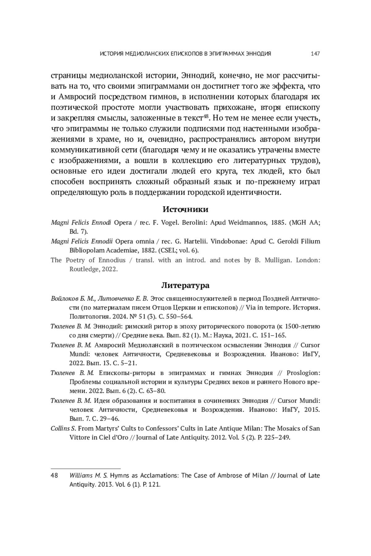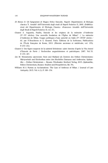 6. Тюленев В. М. Амвросий Медиоланский в поэтическом осмыслении Эннодия // Cursor Mundi: человек Античности, Средневековья и Возрождения. Иваново: ИвГУ, 2022. Вып. 13. С. 5-21.