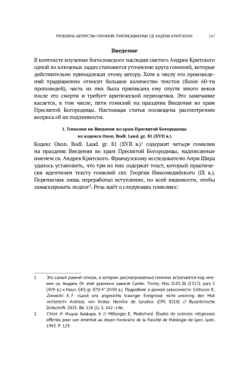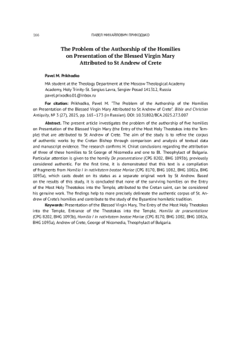 В контексте изучения богословского наследия святого Андрея Критского одной из ключевых задач становится уточнение круга гомилий, которые действительно принадлежат этому автору. Хотя к числу его произведений традиционно относят большое количество текстов (более 60-ти проповедей), часть из них была приписана ему спустя много веков после его смерти и требует критической переоценки. Это замечание касается, в том числе, пяти гомилий на праздник Введения во храм Пресвятой Богородицы. Настоящая статья посвящена рассмотрению вопроса об их подлинности.