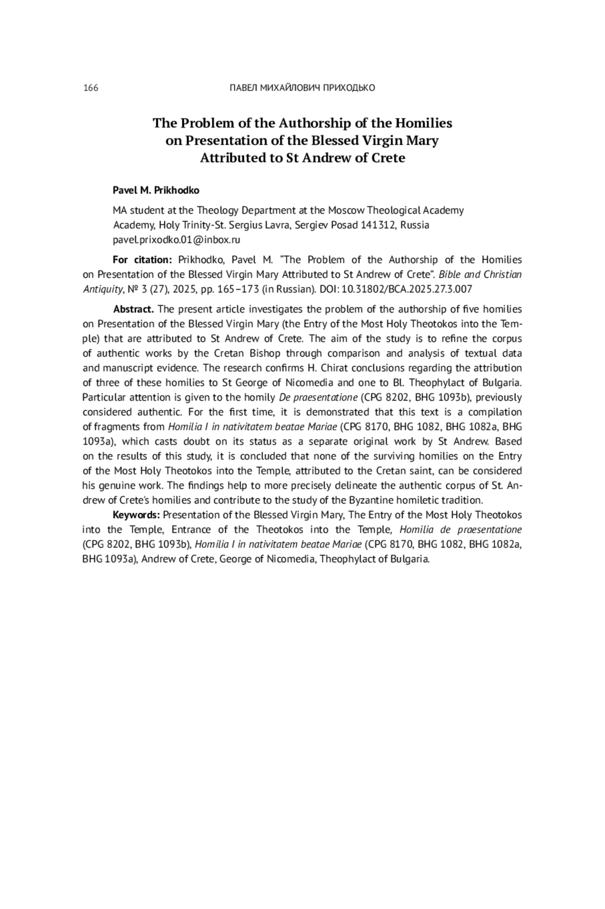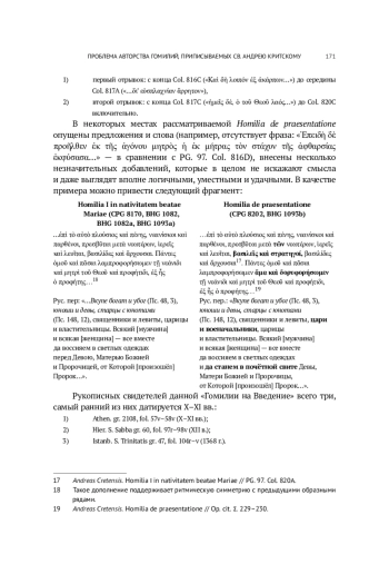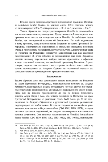 Цель исследования - уточнить корпус подлинных произведений критского святителя на основе сопоставления и анализа текстологических данных и рукописных свидетельств. В ходе исследования подтверждены выводы А. Шира о принадлежности трёх из этих гомилий свт. Георгию Никомидийскому, а четвёртой - блж. Феофилакту Болгарскому. Особое внимание уделяется гомилии De praesentatione (CPG 8202, BHG 1093b), ранее считавшейся подлинной. Впервые показано, что данный текст представляет собой компиляцию из фрагментов Homilia I in nativitatem beatae Mariae (CPG 8170, BHG 1082, BHG 1082a, BHG 1093a), что ставит под сомнение его статус как отдельного оригинального произведения св. Андрея. На основании проведённого исследования делается вывод о том, что ни одна из сохранившихся под именем критского святителя гомилий на Введение во храм Пресвятой Богородицы не может считаться его произведением. Полученные результаты позволяют точнее очертить границы аутентичного корпуса гомилий свт. Андрея Критского и вносят вклад в изучение византийской гомилетической традиции.