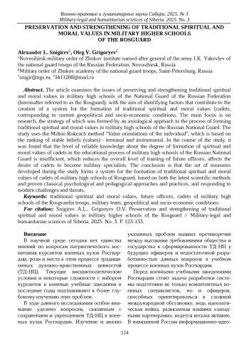 В статье рассматриваются вопросы сохранения и укрепления традиционных духовно-нравственных ценностей в военных вузах войск национальной гвардии Российской Федерации (далее - Росгвардия) с целью определения условий, способствующих созданию системы формирования традиционных духовно-нравственных ценностей курсантов, соответствующей текущим геополитическим и социально-экономическим условиям. Основное внимание уделено исследованию, стратегию которого составил аксиологический подход к процессу формирования традиционных духовно-нравственных ценностей в военных вузах Росгвардии. В исследовании применена методика Милтона Рокича «Ценностные ориентации личности», которая основана на ранжировании устойчивых убеждений (ценностей) - терминальных и инструментальных. В ходе проведенного исследования было установлено, что уровень достоверных знаний о степени сформированности духовно-нравственных ценностей курсантов в учебном процессе военных вузов Росгвардии является недостаточным, что снижает общий уровень подготовки будущих офицеров, влияет на желание обучающихся стать военными специалистами. В заключении сделан вывод о том, что разработанный в ходе исследования комплекс мероприятий образует систему формирования традиционных духовно-нравственных ценностей курсантов военных вузов Росгвардии, основанную как на новейших научных методиках, так и на доказавших свою эффективность классических психолого-педагогических подходах и практиках, и отвечающую современным вызовам и угрозам.