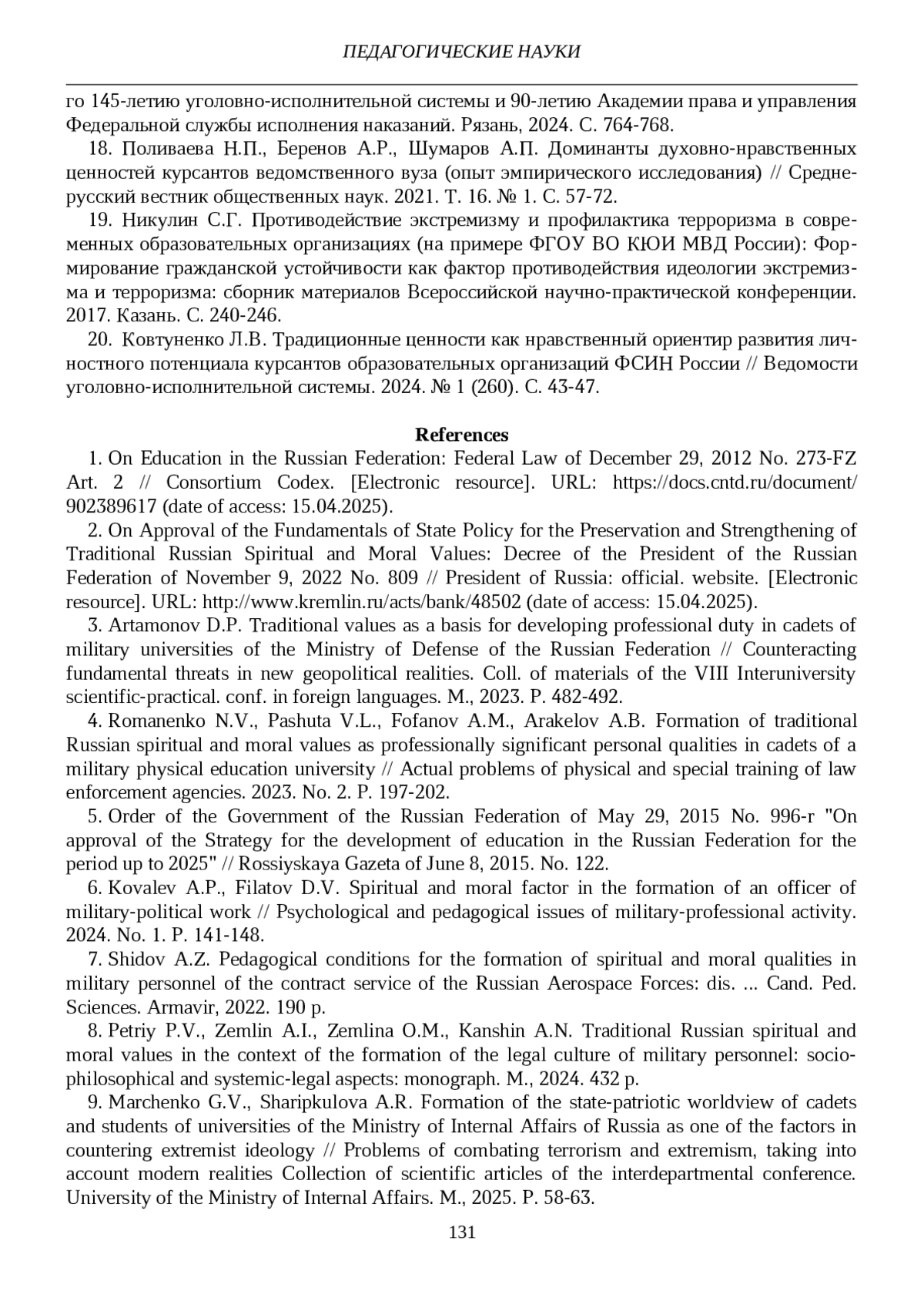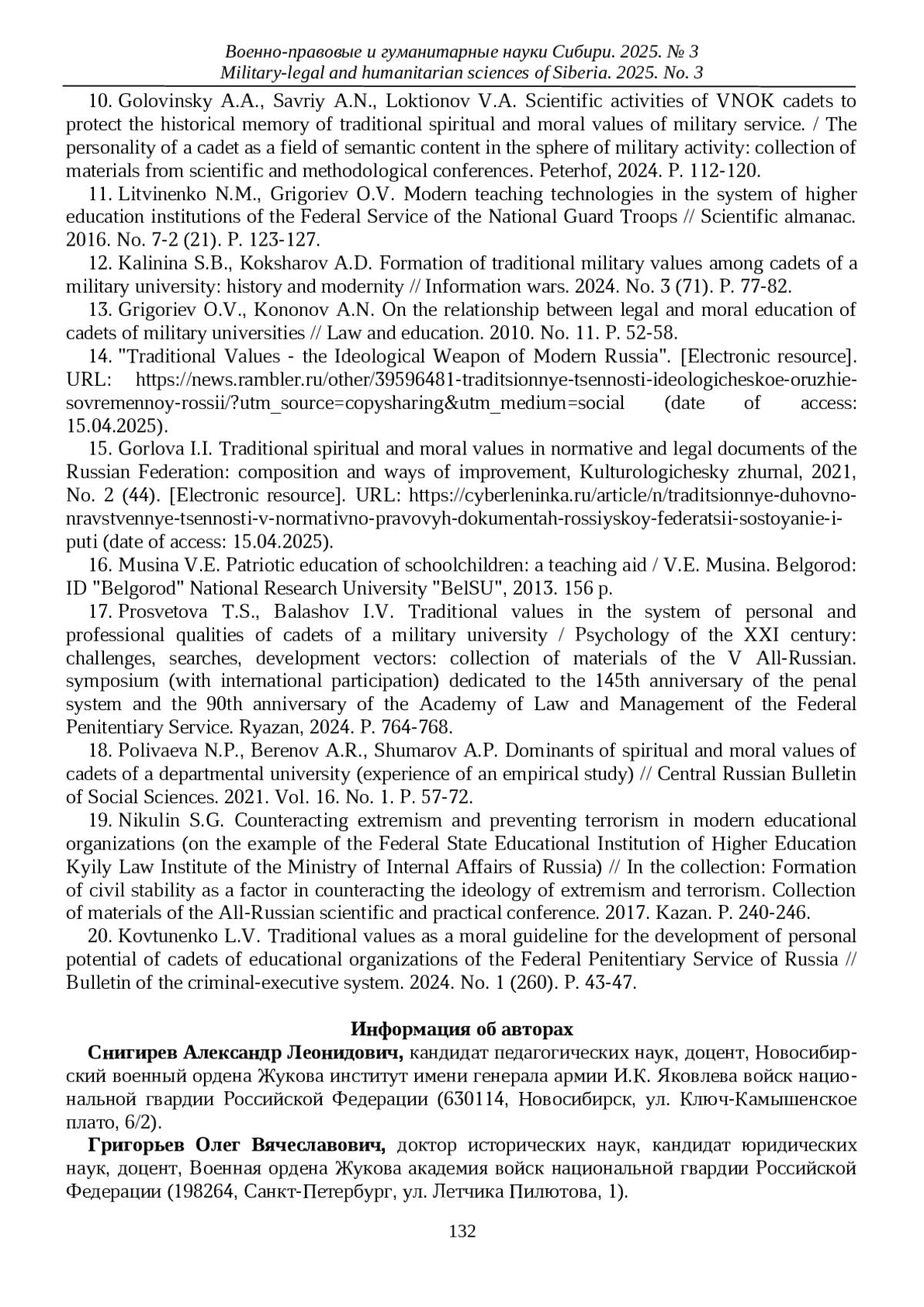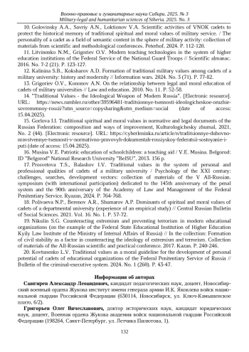 20. Ковтуненко Л.В. Традиционные ценности как нравственный ориентир развития личностного потенциала курсантов образовательных организаций ФСИН России // Ведомости уголовно-исполнительной системы. 2024. № 1 (260). С. 43-47. EDN: XZIQQS