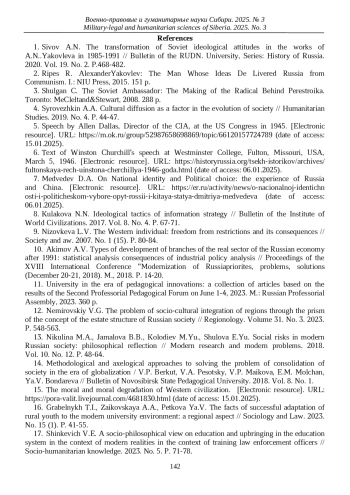 1. Сивов А.Н. Трансформация советских идеологических установок в работах А.Н. Яковлева в 1985-1991 гг. // Вестник РУДН. Серия: История России. 2020. Т. 19. № 2. С. 468-482. EDN: SLGMWE
