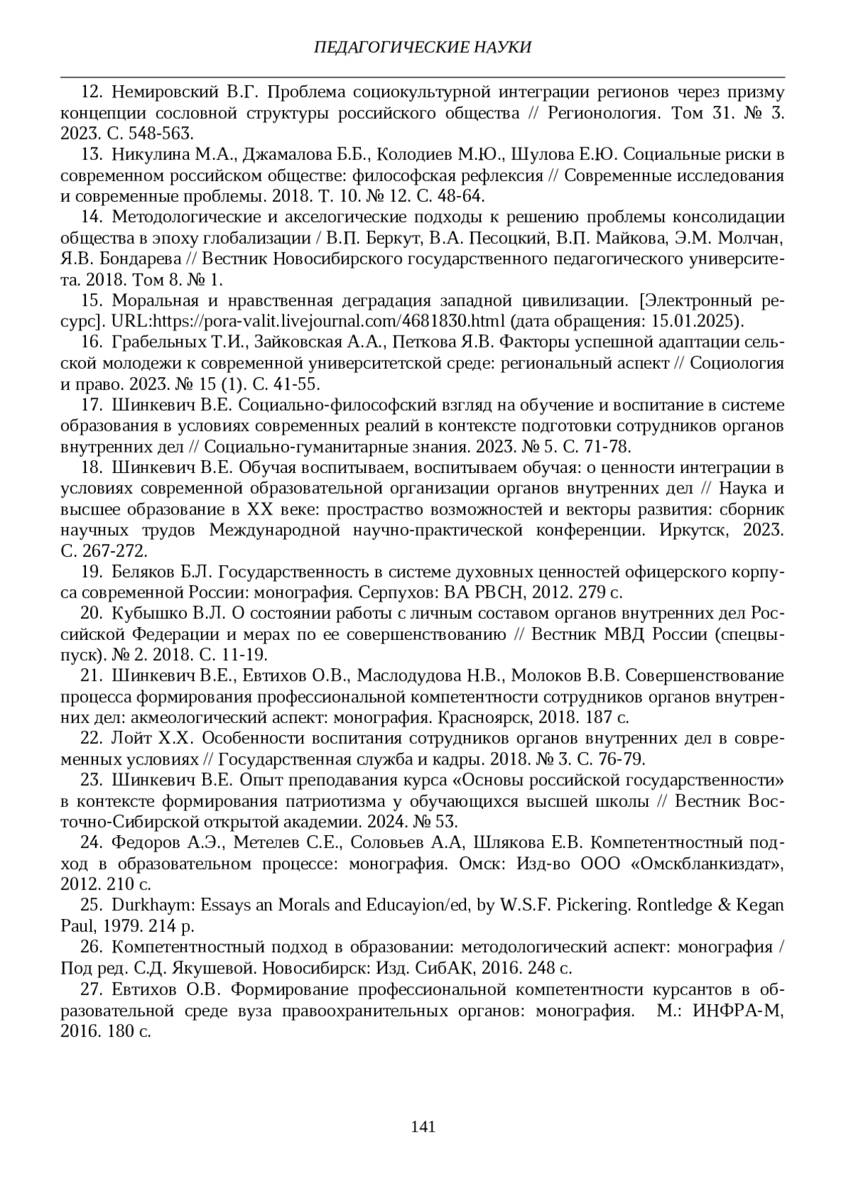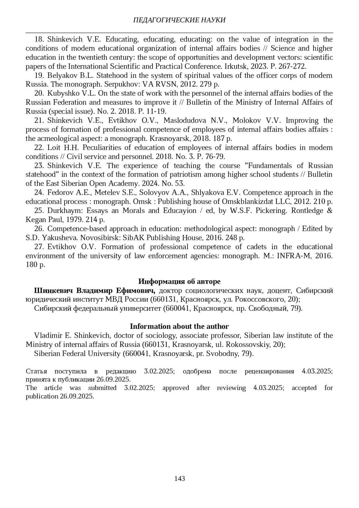 17. Шинкевич В.Е. Социально-философский взгляд на обучение и воспитание в системе образования в условиях современных реалий в контексте подготовки сотрудников органов внутренних дел // Социально-гуманитарные знания. 2023. № 5. С. 71-78. EDN: AGKYDQ