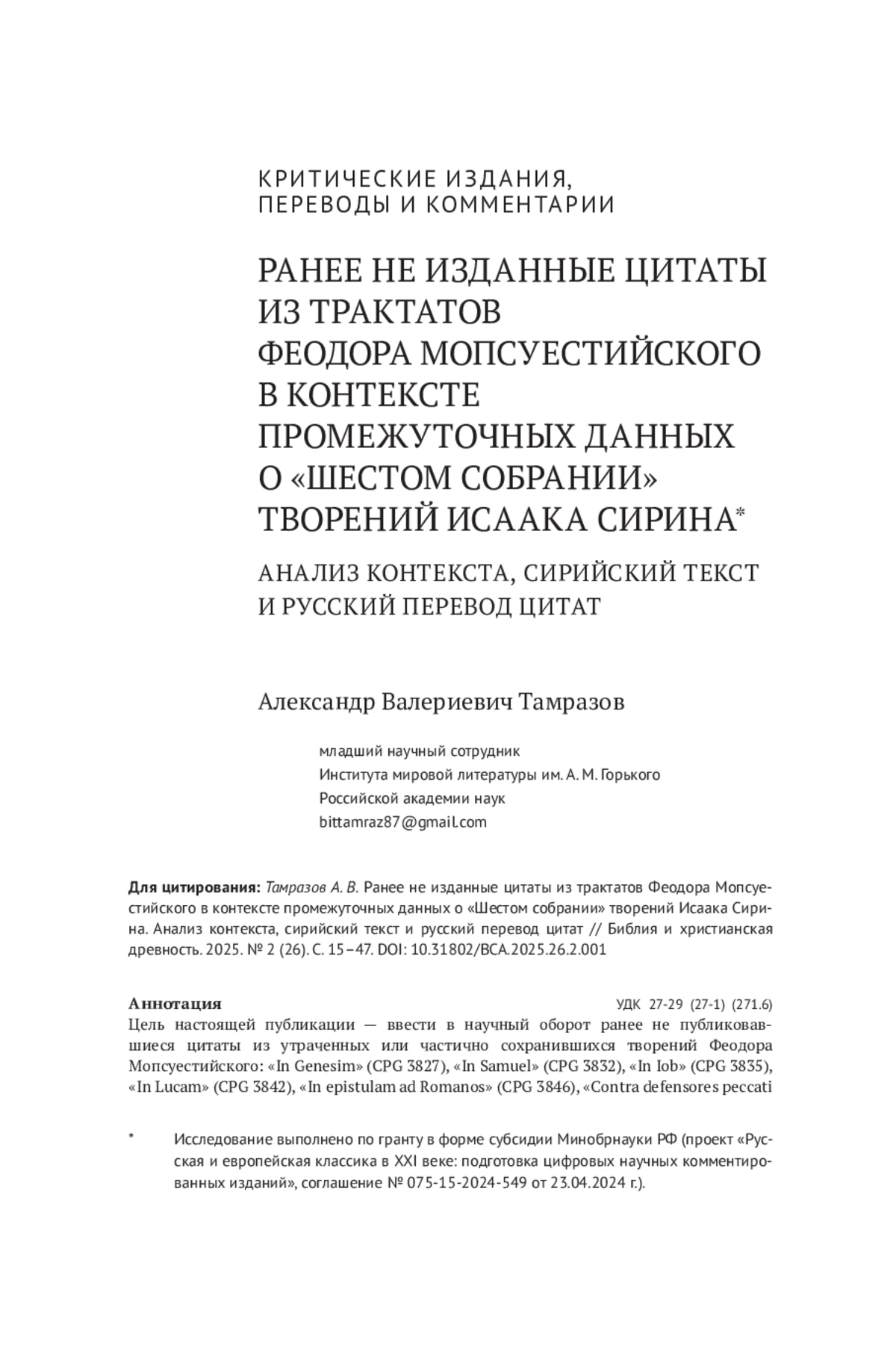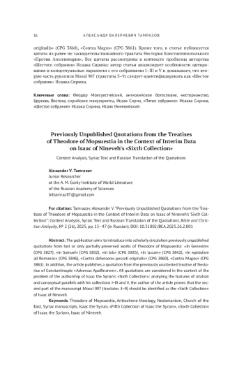 20. Тамразов А. В. Новонайденный фрагмент из “Contra magos” и ранее неизданные сирийские цитаты из других творений Феодора Мопсуестийского / вступ. ст., крит. текст, рус. пер. и коммент. // Библия и христианская древность. 2024. № 2 (22). С. 15-35. EDN: HZAZRD