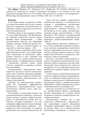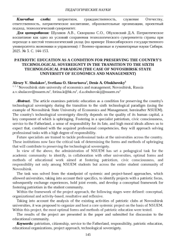 В статье рассматривается патриотическое воспитание как одно из условий сохранения технологического суверенитета страны при переходе в шестой технологический уклад (на примере Новосибирского государственного университета экономики и управления) (далее - НГУЭУ). Технологический суверенитет страны напрямую зависит от качества человеческого капитала, составляющей которого является воспитание. Воспитание у специалиста патриотизма, гражданственности, служения Отечеству, ответственности за его судьбу, высокие нравственные идеалы [1] позволит рассчитывать, что он, с учетом приобретённых профессиональных компетенций, будет ответственно подходить к решению профессиональных задач.
