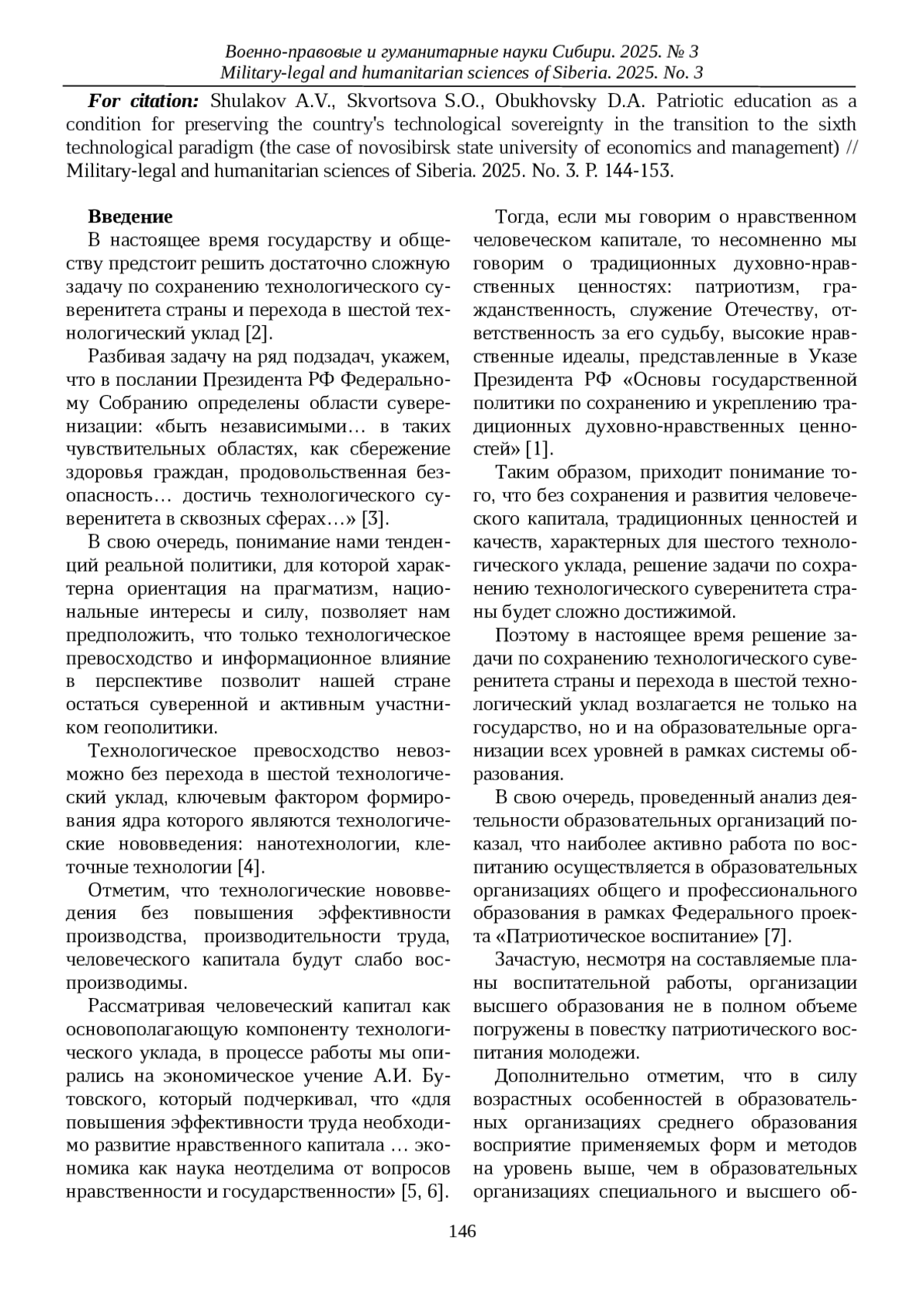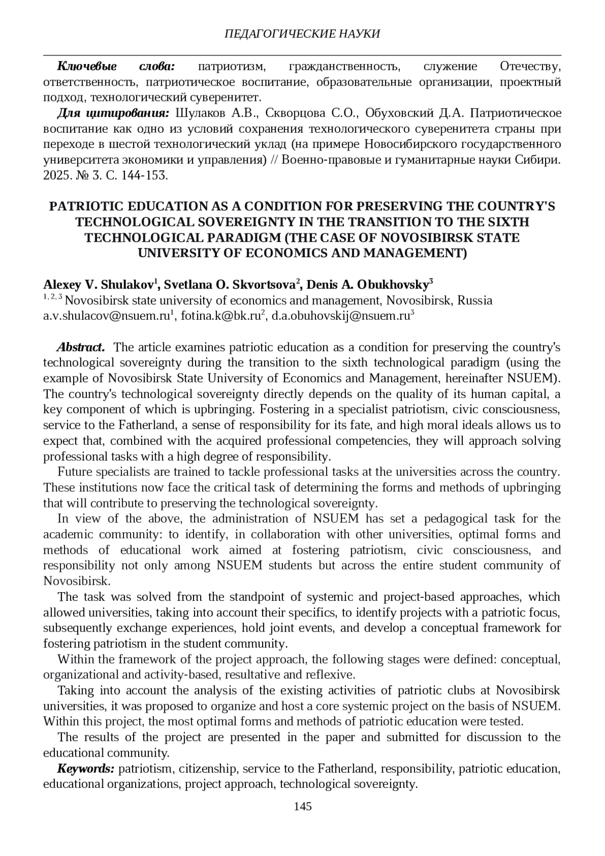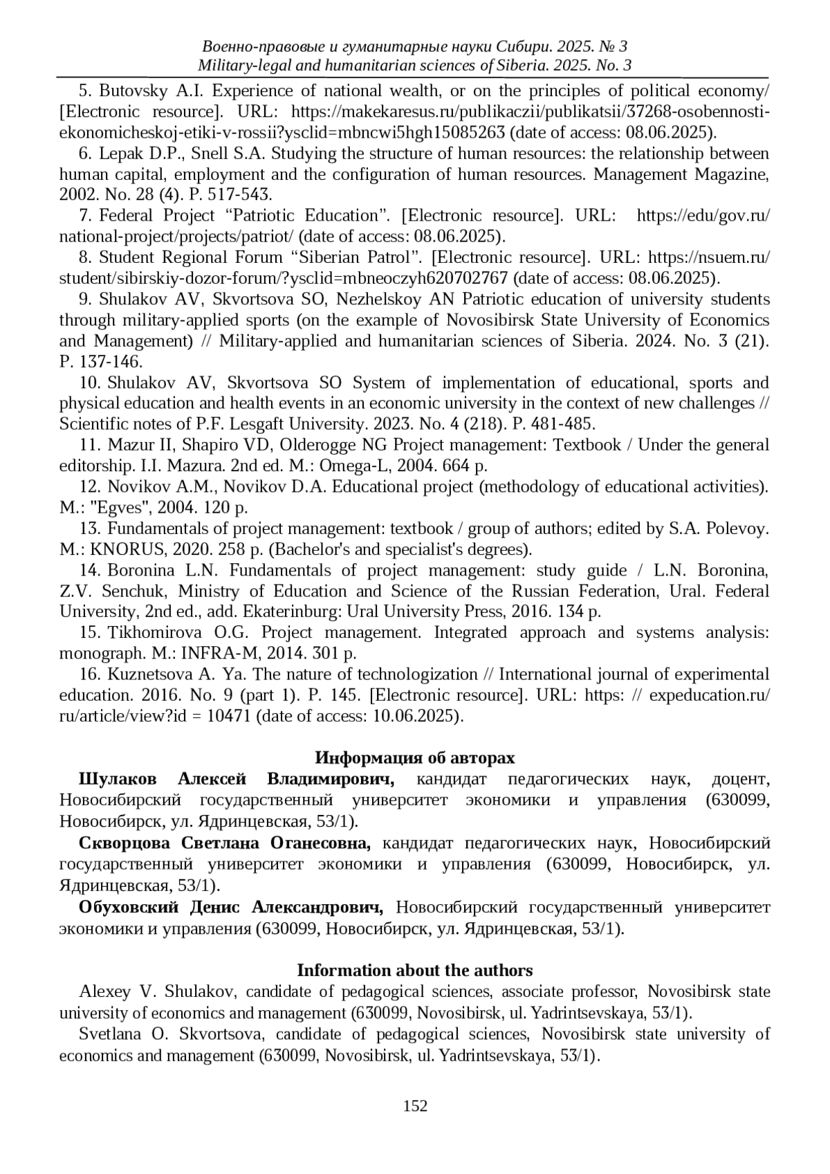 9. Шулаков А.В., Скворцова С.О., Нежельской А.Н. Патриотическое воспитание студентов вузов через военно-прикладные виды спорта (на примере Новосибирского государственного университета экономики и управления) // Военно-прикладные и гуманитарные науки Сибири. 2024. № 3 (21). С. 137-146.