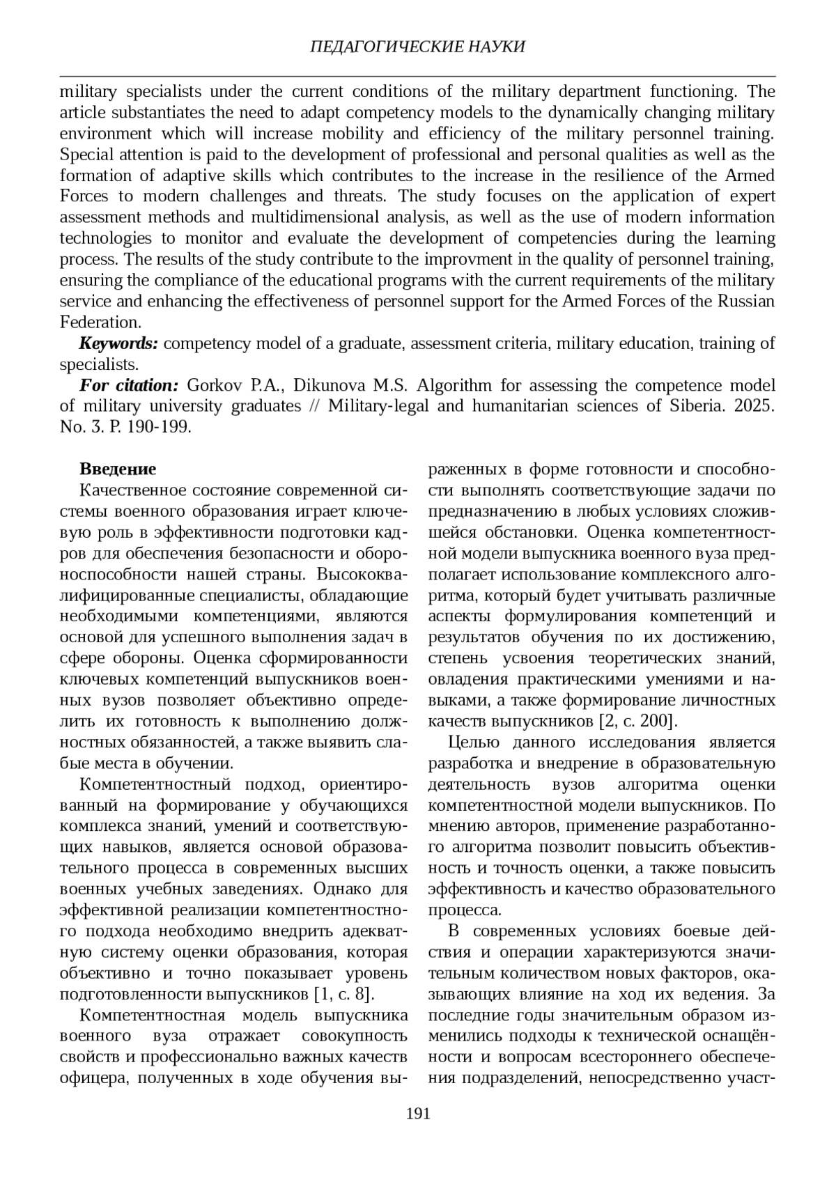 В статье представлен алгоритм оценки компетентностной модели выпускников военных вузов, направленный на структурирование и моделирование процесса обучения в целях повышения его качества и эффективности. Предложенный подход основан на многоступенчатой методике диагностики ключевых компетенций, необходимых для успешной деятельности военных специалистов в современных условиях функционирования военного ведомства. Обоснована необходимость адаптации компетентностностной модели к динамично меняющейся военной среде, что позволяет повысить мобильность и оперативность подготовки военнослужащих. Особое значение уделяется развитию профессиональных и личностных качеств, а также формированию адаптивных навыков, что способствует повышению устойчивости Вооружённых Сил к современным вызовам и угрозам. Акцентировано внимание на применении методов экспертных оценок и многомерного анализа, а также использовании современных информационных технологий в целях мониторинга и оценки сформированности компетенций в процессе обучения. Результаты исследования позволяют повысить качество подготовки кадров, обеспечить соответствие образовательных программ современным требованиям службы и повысить эффективность кадрового обеспечения Вооруженных Сил Российской Федерации.