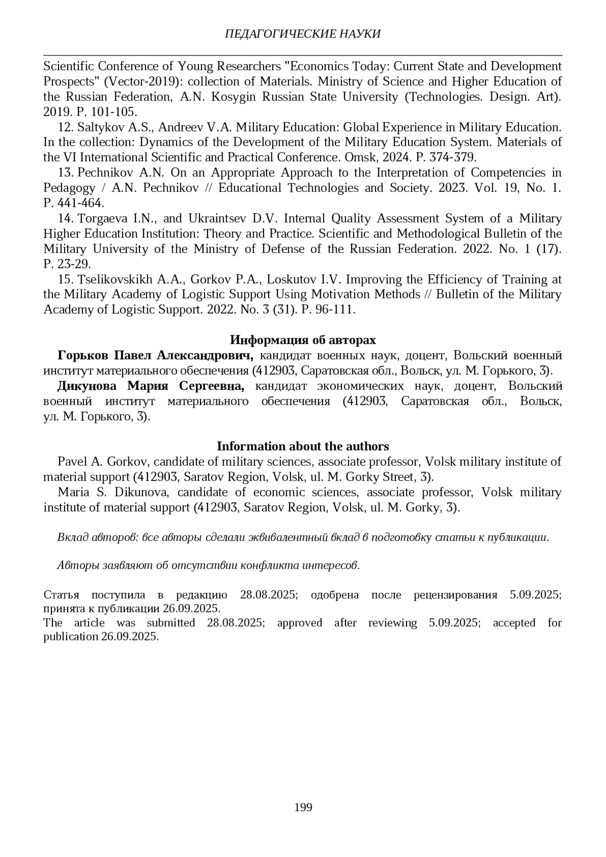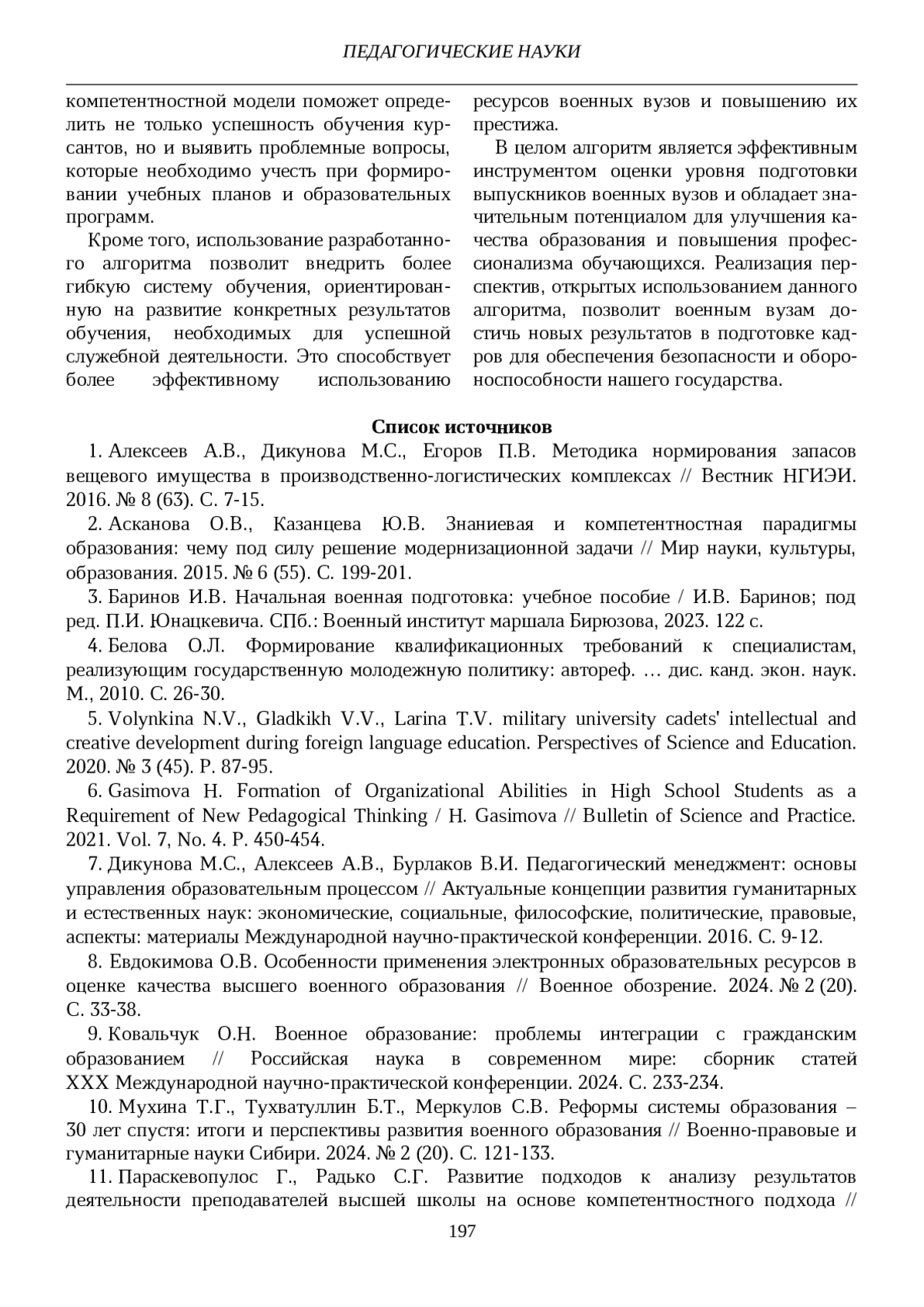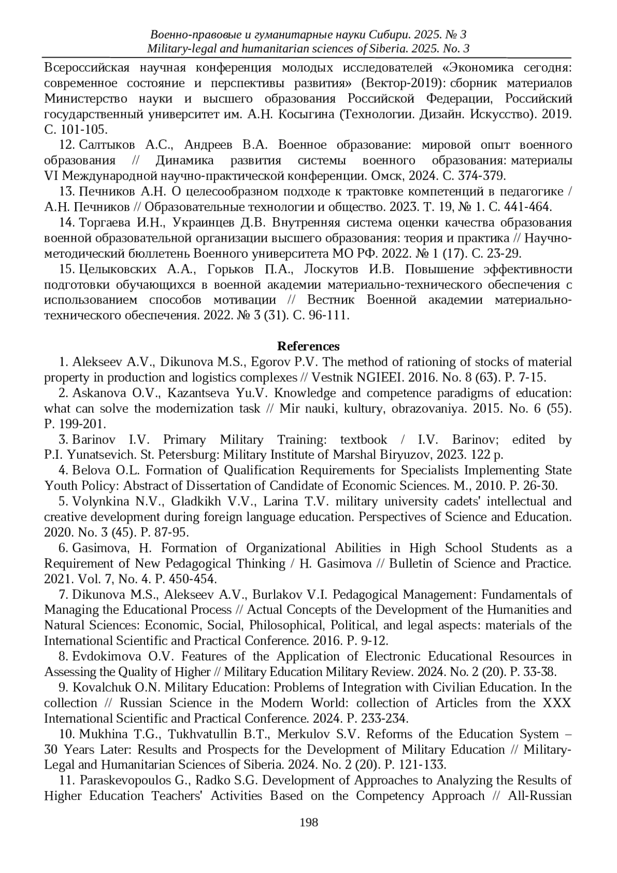 10. Мухина Т.Г., Тухватуллин Б.Т., Меркулов С.В. Реформы системы образования - лет спустя: итоги и перспективы развития военного образования // Военно-правовые и гуманитарные науки Сибири. 2024. № 2 (20). С. 121-133. EDN: KCYDOO