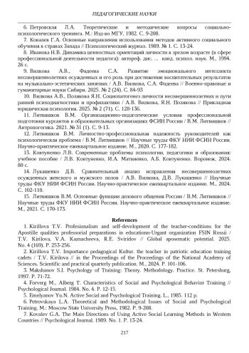 2. Кириллова Т.В. Значение педагогической культуры преподавателя в патриотическом воспитании курсантов образовательных организаций ФСИН России / Т.В. Кириллова // Научные труды ФКУ НИИ ФСИН России. Научно-практическое ежеквартальное издание. М., 2024. С. 101-106. EDN: FEANWL