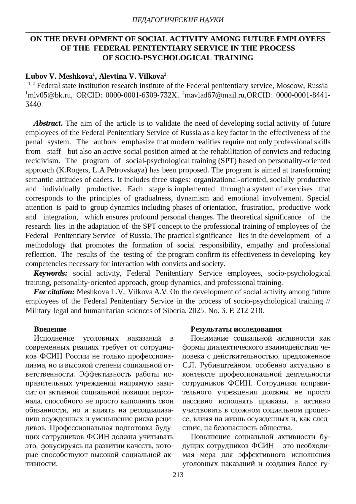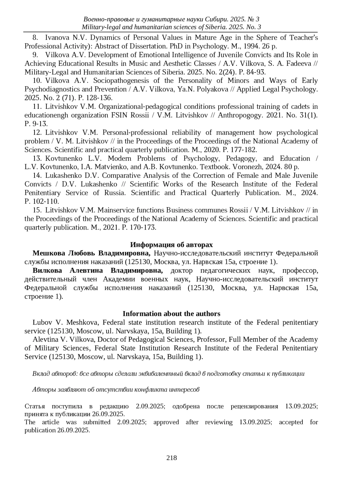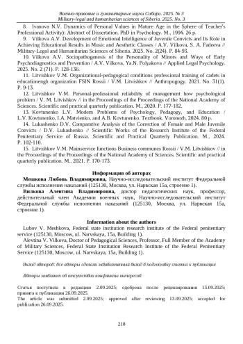 9. Вилкова А.В., Фадеева С.А. Развитие эмоционального интеллекта несовершеннолетних осужденных и его роль при достижении воспитательных результатов на музыкально-эстетических занятиях / А.В. Вилкова, С.А. Фадеева // Военно-правовые и гуманитарные науки Сибири. 2025. № 2 (24). С. 84-93. EDN: XMNKVI