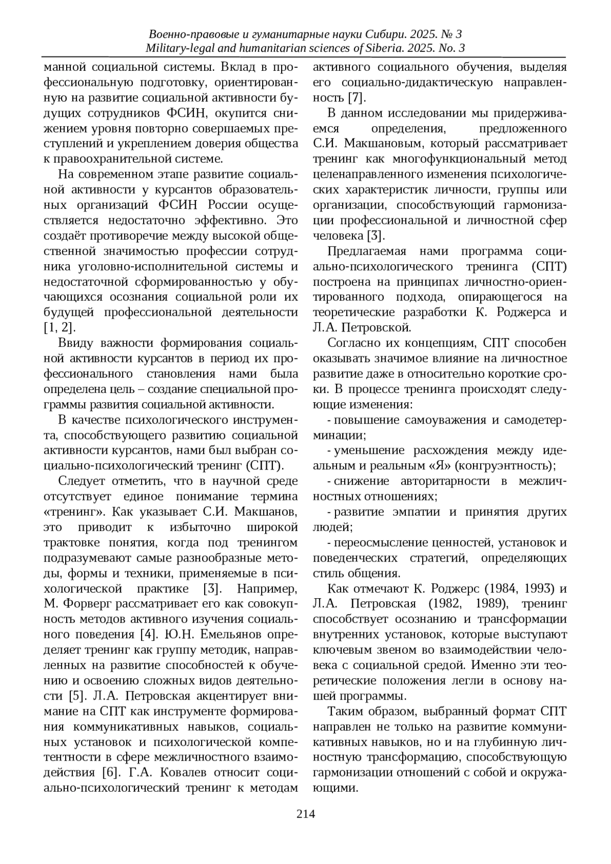 В статье обосновывается необходимость развития социальной активности будущих сотрудников ФСИН России как ключевого фактора эффективности уголовно-исполнительной системы. Авторы подчеркивают, что современные реалии требуют от персонала не только профессиональных навыков, но и активной социальной позиции, направленной на ресоциализацию осужденных и снижение рецидивной преступности. В качестве решения предлагается программа социально-психологического тренинга (СПТ), основанная на личностно-ориентированном подходе (К. Роджерс, Л. А. Петровская) и направленная на трансформацию смысловых установок курсантов. Программа включает три этапа: организационно-ориентировочный, социально-продуктивный и индивидуально-продуктивный, каждый из которых реализуется через систему упражнений, соответствующих принципам постепенности, динамичности и эмоциональной вовлеченности. Особое внимание уделяется групповой динамике, включая фазы ориентации, фрустрации, продуктивной работы и интеграции, что обеспечивает глубинные личностные изменения. Теоретическая значимость исследования заключается в адаптации концепции СПТ к профессиональной подготовке сотрудников ФСИН России, а практическая - в разработке методики, способствующей формированию социальной ответственности, эмпатии и профессиональной рефлексии. Результаты апробации программы подтверждают ее эффективность в развитии ключевых компетенций, необходимых для взаимодействия с осужденными и обществом.