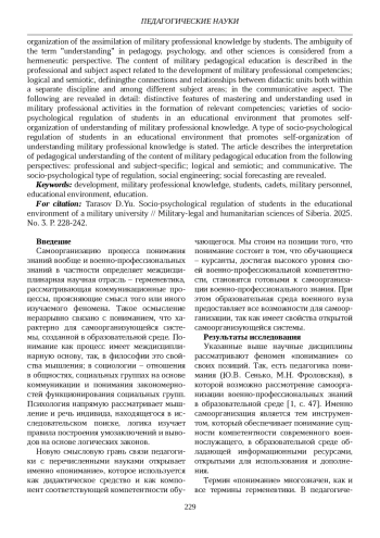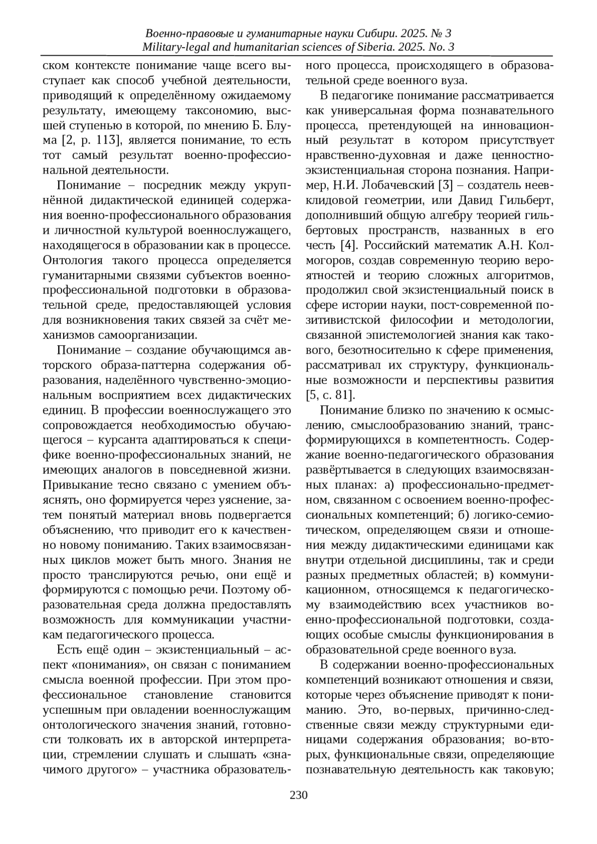 Публикация посвящена рассмотрению социально-психологической регуляции обучающихся в образовательной среде военного вуза, описанию влияния её на процесс самоорганизации усвоения военно-профессиональных знаний обучающимися. Рассмотрена многозначность термина «понимание» в педагогике, психологии, других науках с позиции герменевтики. Описано содержание военно-педагогического образования в профессионально-предметном аспекте освоения военно-профессиональных компетенций; в логико-семиотическом, определяющем связи и отношения между дидактическими единицами как внутри отдельной дисциплины, так и среди разных предметных областей; в коммуникационном аспекте. Содержательно раскрыты: отличительные черты освоения и понимания военно-профессиональной деятельности при формировании соответствующих компетенций; разновидности социально-психологической регуляции обучающихся в образовательной среде, способствующей самоорганизации понимания военно-профессиональных знаний. Констатирована разновидность социально-психологической регуляции обучающихся в образовательной среде, способствующей самоорганизации понимания военно-профессиональных знаний. Описана интерпретация педагогического понимания содержания военно-педагогического образования с позиций: профессионально-предметной; логико-семиотической; коммуникационной. Раскрыты социально-психологический вид регуляции; социальная инженерия; социальное прогнозирование.