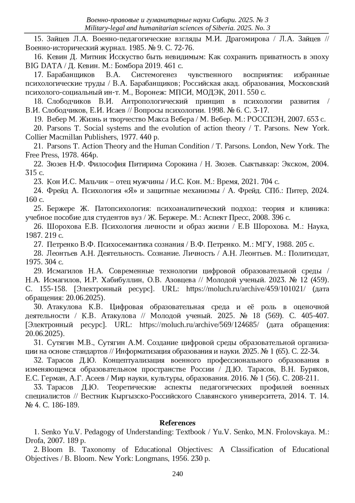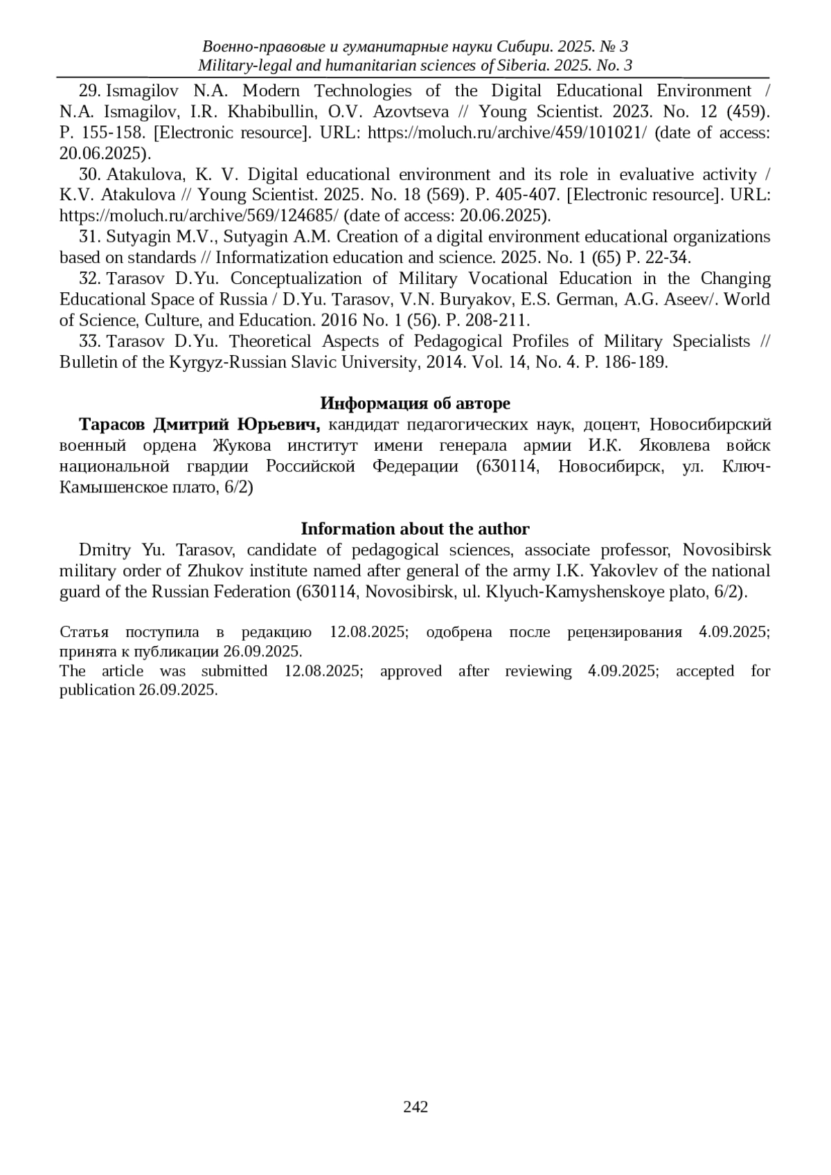 32. Тарасов Д.Ю. Концептуализация военного профессионального образования в изменяющемся образовательном пространстве России / Д.Ю. Тарасов, В.Н. Буряков, Е.С. Герман, А.Г. Асеев / Мир науки, культуры, образования. 2016. № 1 (56). С. 208-211. EDN: VOTQZJ