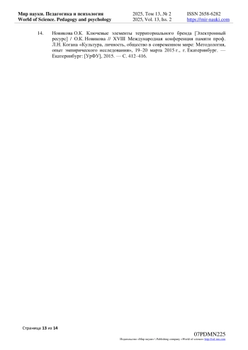 14. Новикова О.К. Ключевые элементы территориального бренда [Электронный ресурс] / О.К. Новикова // XVIII Международная конференция памяти проф. Л.Н. Когана “Культура, личность, общество в современном мире: Методология, опыт эмпирического исследования”, 19-20 марта 2015 г., г. Екатеринбург. - Екатеринбург: [УрФУ], 2015. - С. 412-416.