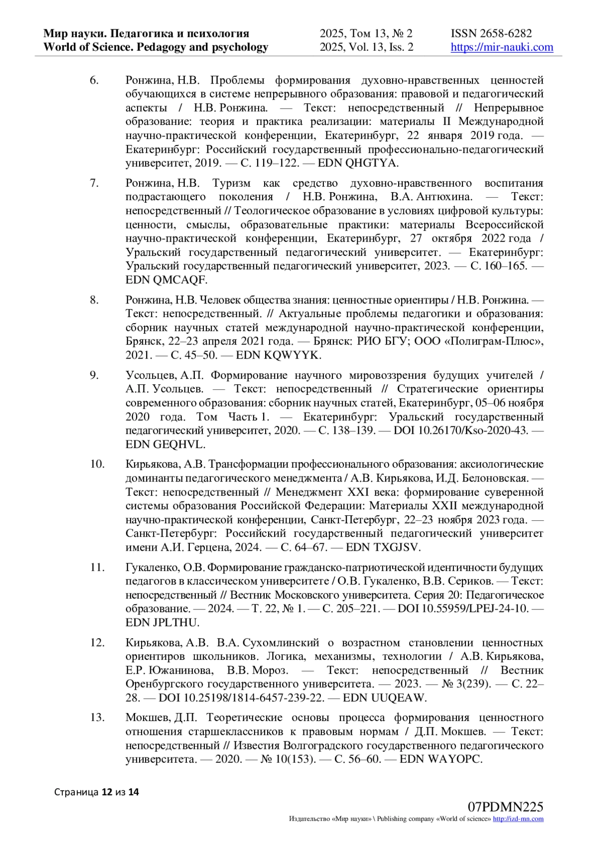 6. Ронжина, Н.В. Проблемы формирования духовно-нравственных ценностей обучающихся в системе непрерывного образования: правовой и педагогический аспекты / Н.В. Ронжина. - Текст: непосредственный // Непрерывное образование: теория и практика реализации: материалы II Международной научно-практической конференции, Екатеринбург, 22 января 2019 года. - Екатеринбург: Российский государственный профессионально-педагогический университет, 2019. - С. 119-122. EDN: QHGTYA