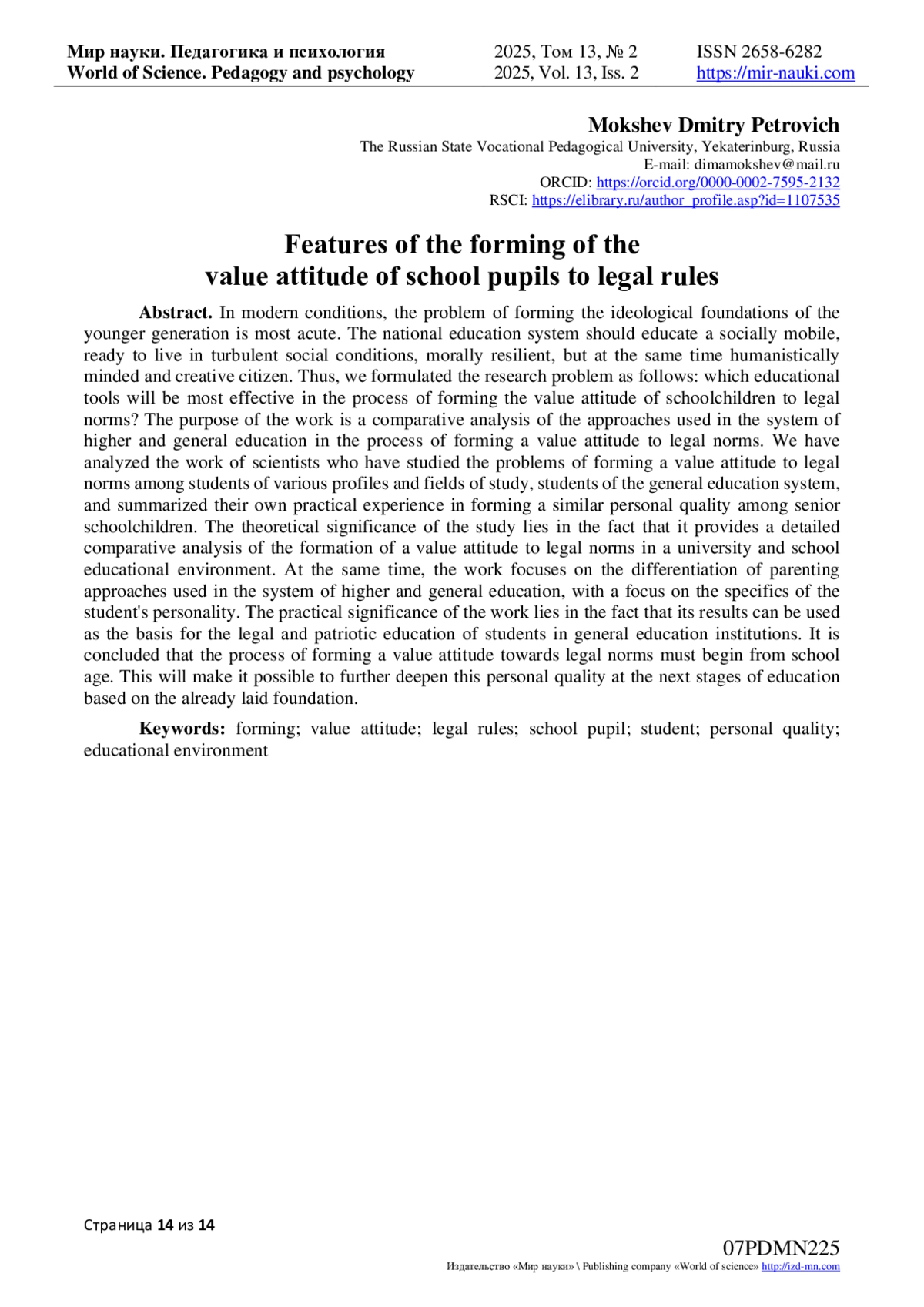 13. Мокшев, Д.П. Теоретические основы процесса формирования ценностного отношения старшеклассников к правовым нормам / Д.П. Мокшев. - Текст: непосредственный // Известия Волгоградского государственного педагогического университета. - 2020. - № 10(153). - С. 56-60. EDN: WAYOPC