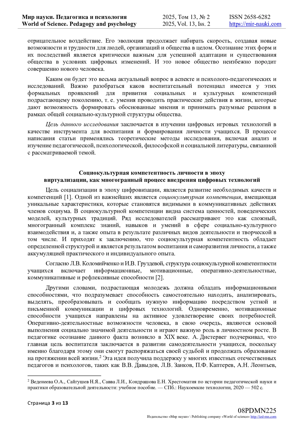 1. Рожников А.А., Паллотта В.И. Цифровая социализация учащихся как актуальная проблема научно-педагогического исследования // Вестник ГГУ. - 2024 - № 2 - С. 305-322.