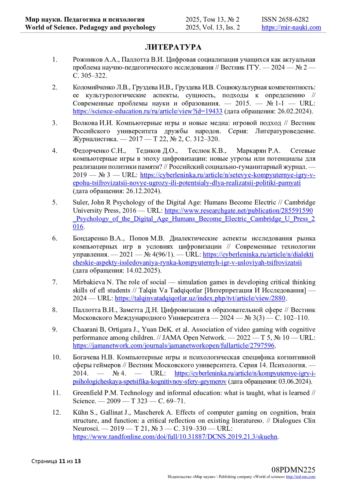 12. Kühn S., Gallinat J., Mascherek A. Effects of computer gaming on cognition, brain structure, and function: a critical reflection on existing literatureю. // Dialogues Clin Neurosci. - 2019 - Т 21, № 3 - С. 319-330 - URL: https://www.tandfonline.com/doi/full//skuehn. DOI: 10.31887/DCNS.2019.21.3