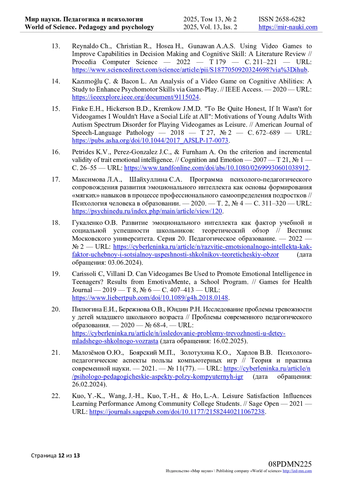 13. Reynaldo Ch., Christian R., Hosea H., Gunawan A.A.S. Using Video Games to Improve Capabilities in Decision Making and Cognitive Skill: A Literature Review // Procedia Computer Science - 2022 - Т 179 - С. 211-221 - URL: https://www.sciencedirect.com/science/article/pii/S1877050920324698?via%3Dihub.