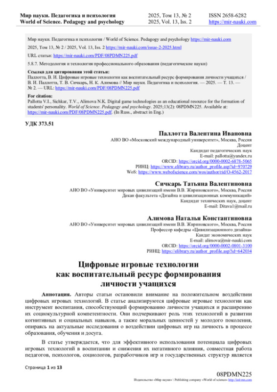 Авторы статьи остановили внимание на положительном воздействии цифровых игровых технологий. В статье анализируются цифровые игровые технологии как инструмент воспитания, способствующий формированию личности учащихся и расширению их социокультурной компетентности. Они подчеркивают роль этих технологий в развитии когнитивных и социальных навыков, а также моральных ценностей у молодого поколения, опираясь на актуальные исследования о воздействии цифровых игр на личность в процессе образования, обучения и досуга.