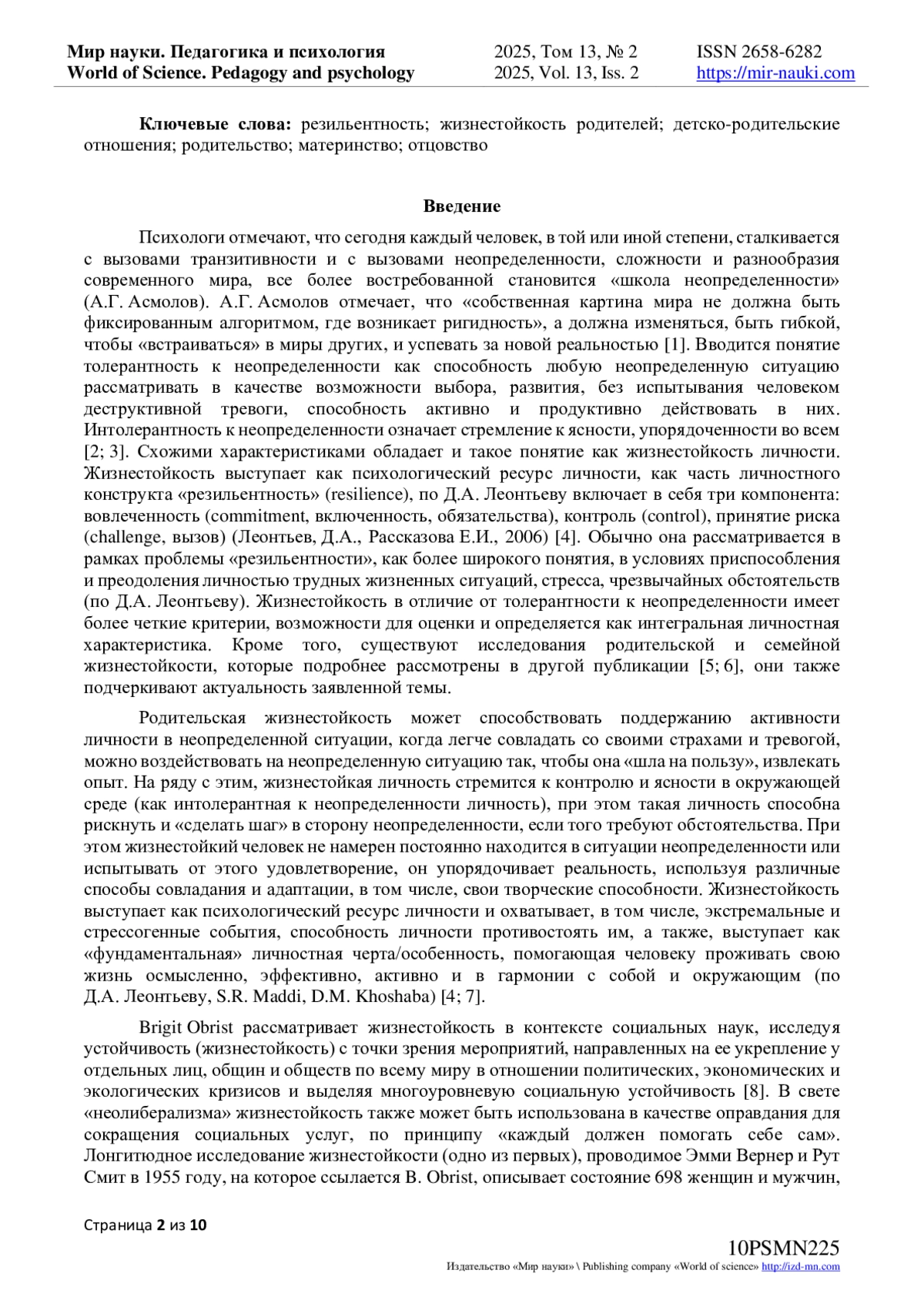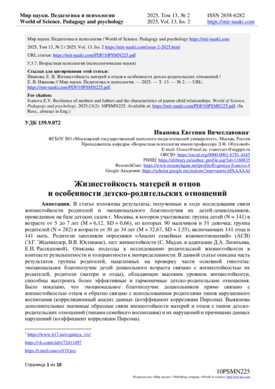 В статье изложены результаты, полученные в ходе исследования связи жизнестойкости родителей и эмоционального благополучия их детей-дошкольников, проведенное на базе детских садов г. Москвы, в котором участвовали: группа детей (N = 141) в возрасте от 5 до 7 лет (М = 6,12, SD = 0,66), из которых 90 мальчиков и 51 девочка; группа родителей (N = 282) в возрасте от 30 до 34 лет (М = 32,67, SD = 1,55), включающих 141 отца и 141 мать. Родители заполняли опросники «Анализ семейных взаимоотношений» (АСВ) (Э. Г. Эйдемиллер, В. В. Юстицкис), тест жизнестойкости (С. Мадди, в адаптации Д. А. Леонтьева, Е. И. Рассказовой). Описаны подходы к исследованию родительской жизнестойкости в контексте резильентности и толерантности к неопределенности. В данной статье описана часть результатов группы родителей, нацеленных на проверку части основной гипотезы: эмоциональное благополучие детей дошкольного возраста связано с жизнестойкостью их родителей, родители (матери и отцы), обладающие высоким уровнем жизнестойкости, способны выстроить более эффективные и гармоничные детско-родительские отношения. Было показано, что эмоциональное благополучие дошкольников прямо связано с жизнестойкостью отцов и обратно связано с использованием родителями типов нарушенного воспитания (корреляционный анализ данных (коэффициент корреляции Пирсона). Выявлены дополнительные значимые обратные связи жизнестойкости матерей и отцов с типом детско-родительских отношений (типами семейного воспитания) и их нарушений и причинами данных нарушений (коэффициент корреляции Пирсона).