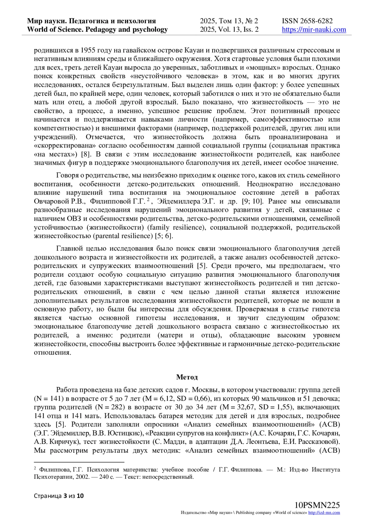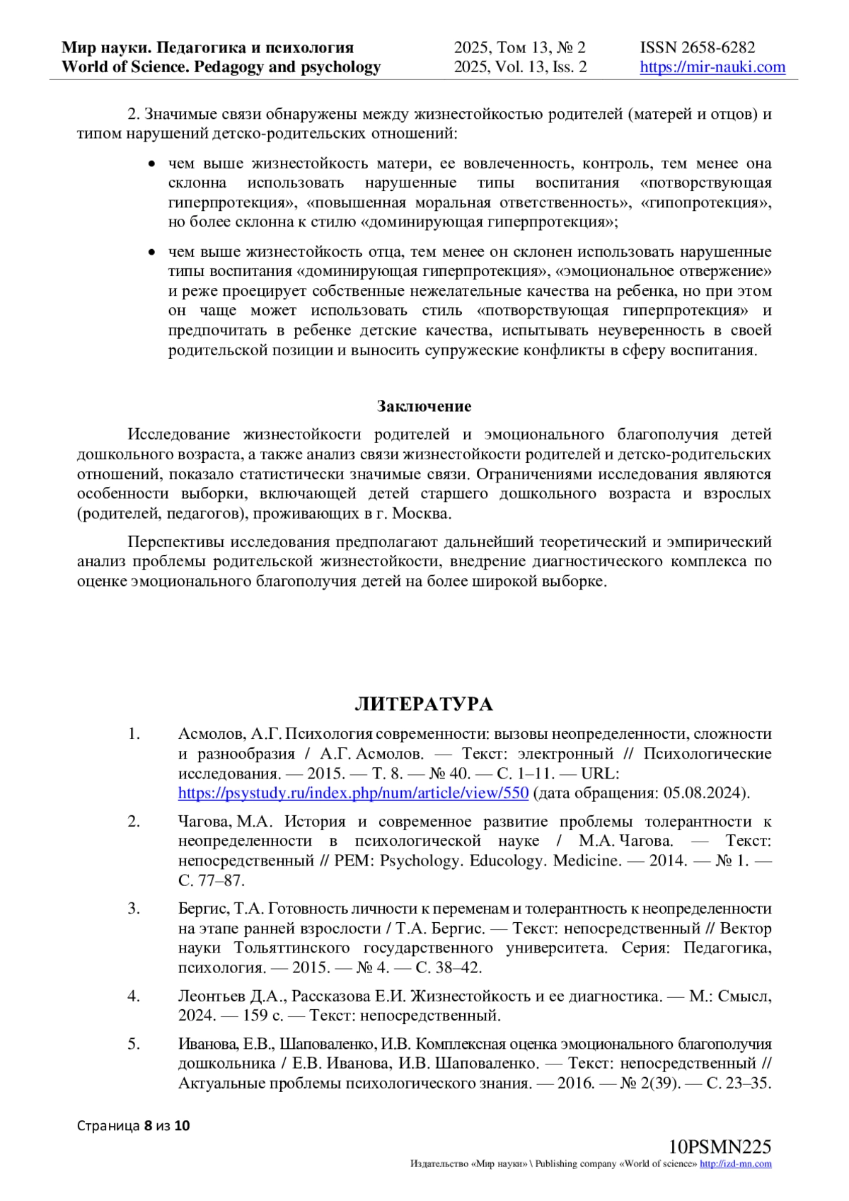 6. Иванова, Е.В., Шаповаленко, И.В. Проблема психологического и эмоционального благополучия детей и жизнестойкости их родителей в современных зарубежных исследованиях / Е.В. Иванова, И.В. Шаповаленко. - Текст: электронный // Современная зарубежная психология. - 2023. - Том 12. - № 3. - C. 52-63. URL: 10.17759/jmfp.2023120305 (дата обращения: 20.01.2025). DOI: 10.17759/jmfp.2023120305( EDN: DQTSKA