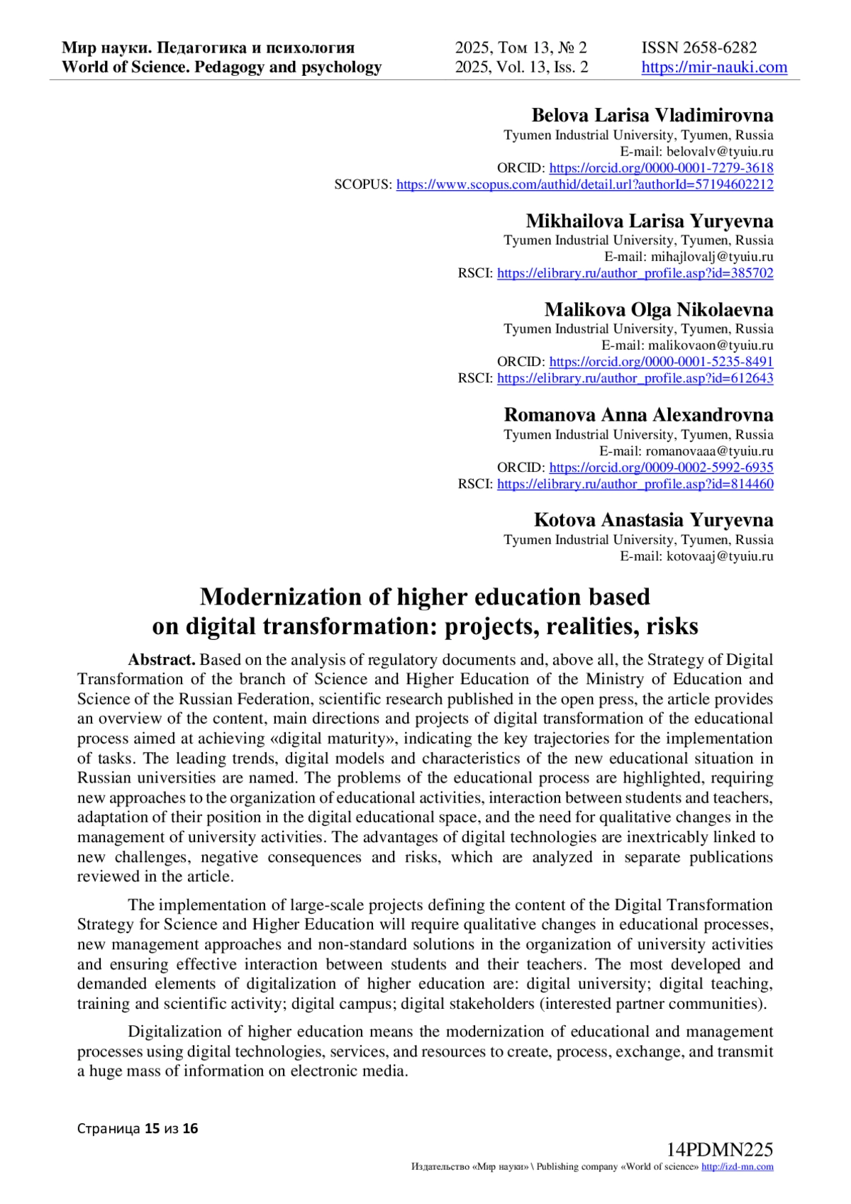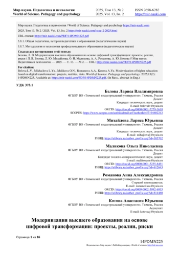 16. Белова, Л.В. Модели цифрового университета и риски их внедрения / Л.В. Белова // Информационные и графические технологии в профессиональной и научной деятельности: Сборник статей Международной научно-практической конференции, Тюмень, 25-26 октября 2023 года. - Тюмень: Тюменский индустриальный университет, 2023. - С. 25-31. EDN: KKBAXQ