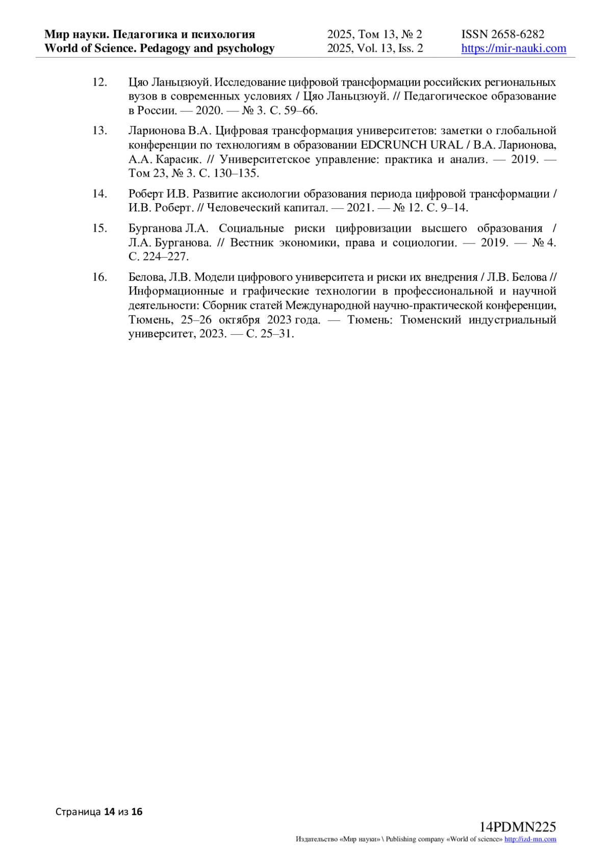 15. Бурганова Л.А. Социальные риски цифровизации высшего образования / Л.А. Бурганова. // Вестник экономики, права и социологии. - 2019. - № 4. С. 224-227. EDN: QHSUJP