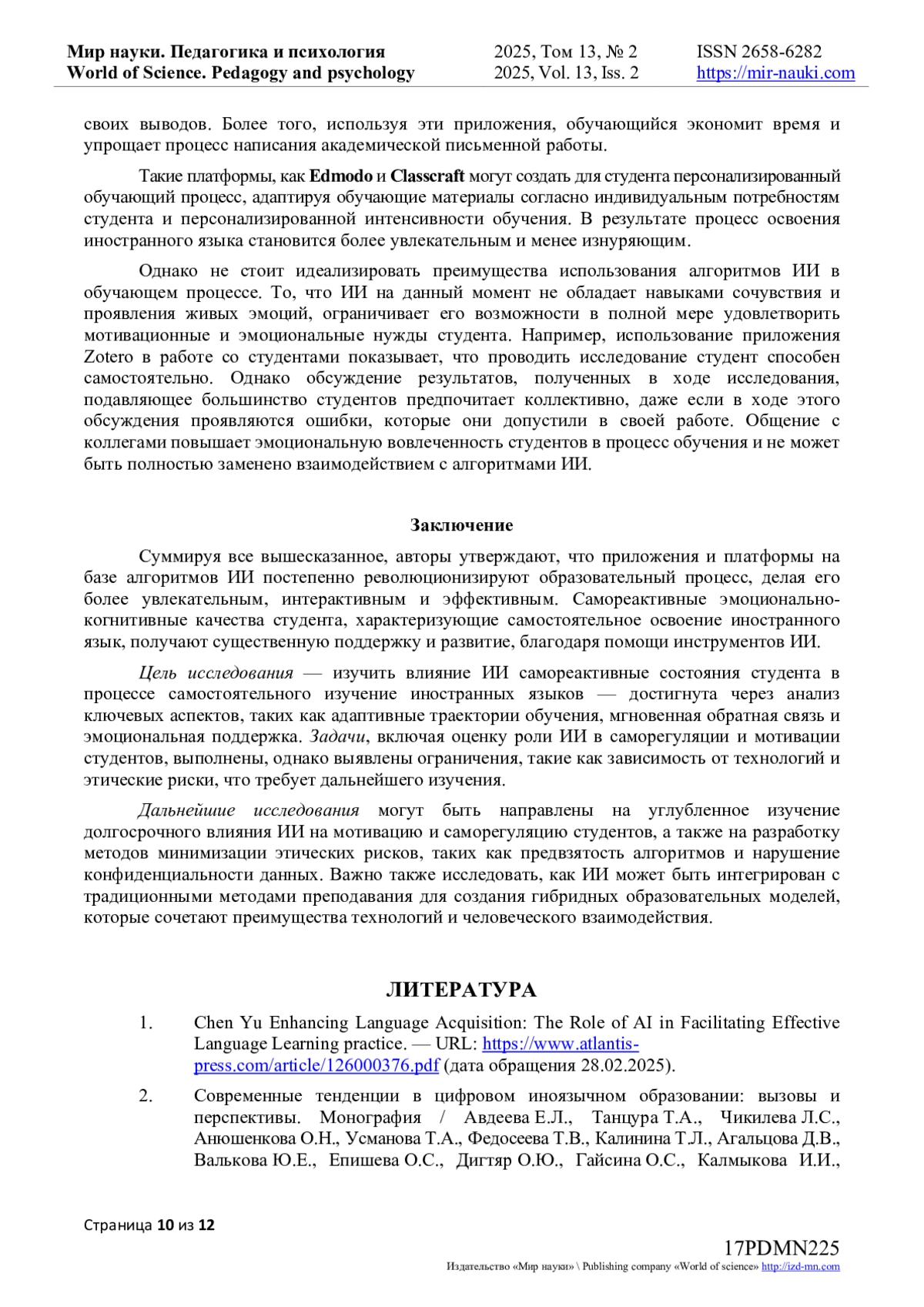 1. Chen Yu Enhancing Language Acquisition: The Role of AI in Facilitating Effective Language Learning practice. - URL: https://www.atlantis-press.com/article/126000376.pdf (дата обращения 28.02.2025).