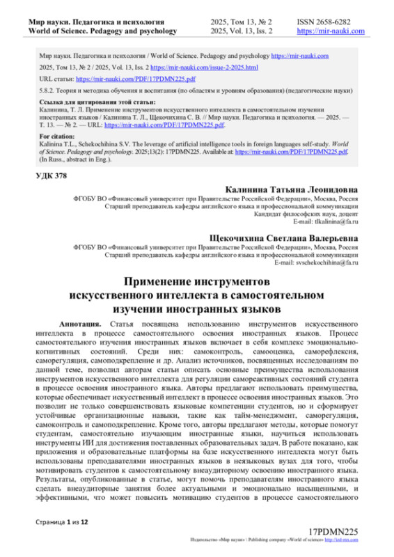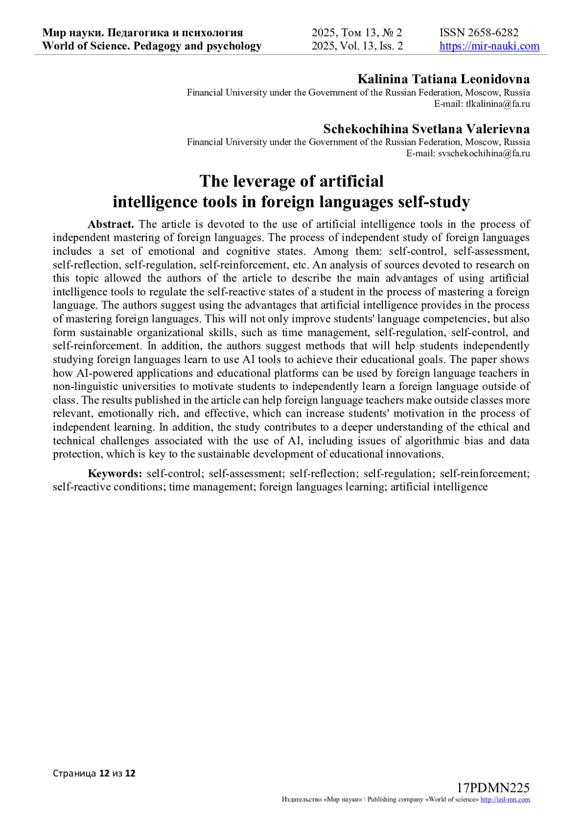 Статья посвящена использованию инструментов искусственного интеллекта в процессе самостоятельного освоения иностранных языков. Процесс самостоятельного изучения иностранных языков включает в себя комплекс эмоционально-когнитивных состояний. Среди них: самоконтроль, самооценка, саморефлексия, саморегуляция, самоподкрепление и др. Анализ источников, посвященных исследованиям по данной теме, позволил авторам статьи описать основные преимущества использования инструментов искусственного интеллекта для регуляции самореактивных состояний студента в процессе освоения иностранного языка. Авторы предлагают использовать преимущества, которые обеспечивает искусственный интеллект в процессе освоения иностранных языков. Это позволит не только совершенствовать языковые компетенции студентов, но и сформирует устойчивые организационные навыки, такие как тайм-менеджмент, саморегуляция, самоконтроль и самоподкрепление. Кроме того, авторы предлагают методы, которые помогут студентам, самостоятельно изучающим иностранные языки, научиться использовать инструменты ИИ для достижения поставленных образовательных задач. В работе показано, как приложения и образовательные платформы на базе искусственного интеллекта могут быть использованы преподавателями иностранных языков в неязыковых вузах для того, чтобы мотивировать студентов к самостоятельному внеаудиторному освоению иностранного языка. Результаты, опубликованные в статье, могут помочь преподавателям иностранного языка сделать внеаудиторные занятия более актуальными и эмоционально насыщенными, и эффективными, что может повысить мотивацию студентов в процессе самостоятельного обучения. Кроме этого, проведенное исследование способствует более глубокому пониманию этических и технических вызовов, связанных с использованием ИИ, включая вопросы предвзятости алгоритмов и защиты данных, что имеет ключевое значение для устойчивого развития образовательных инноваций.