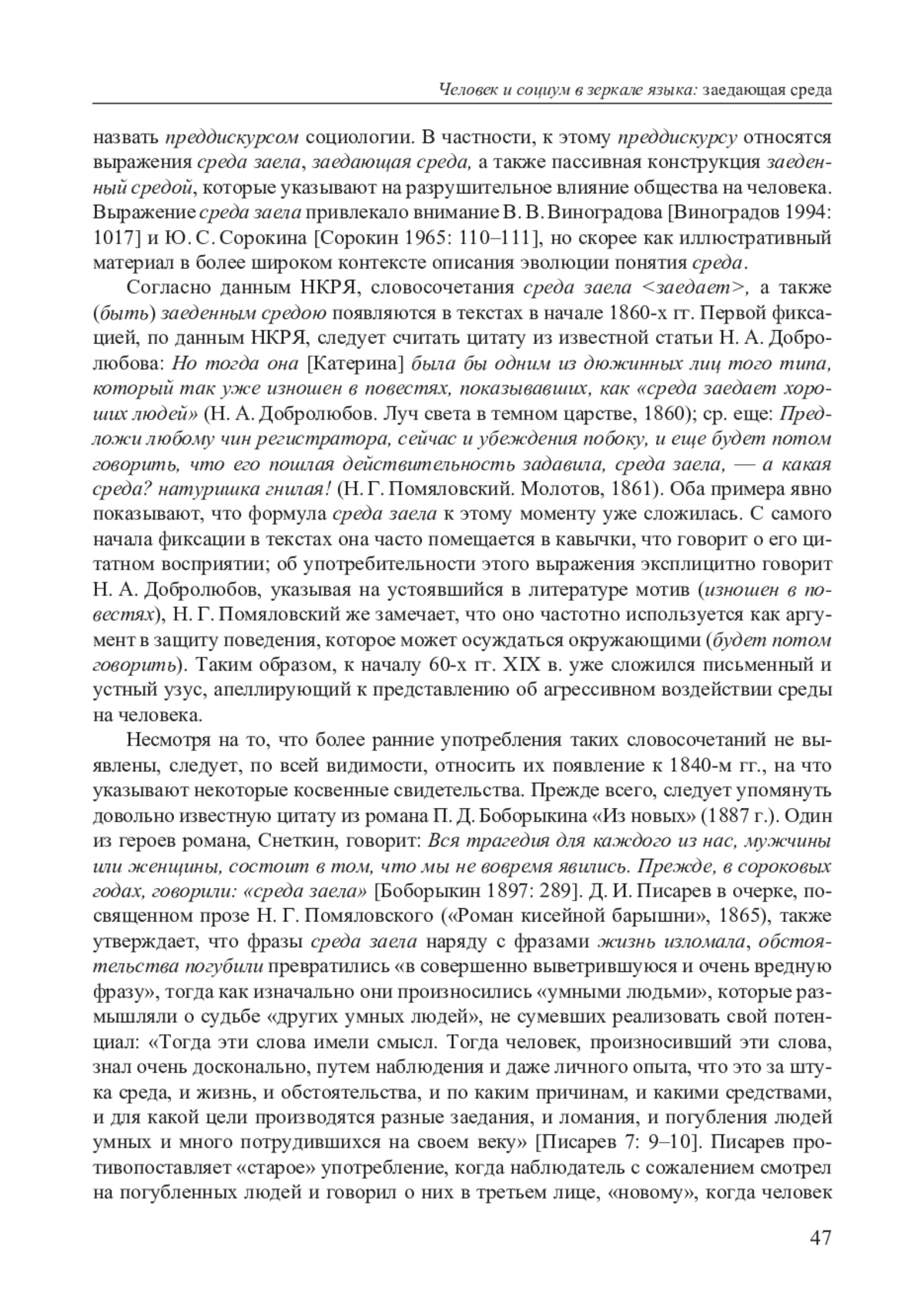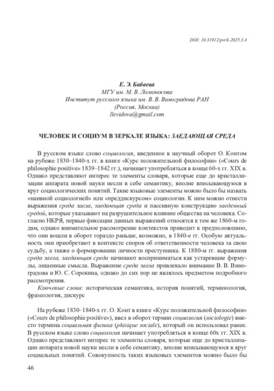 В русском языке слово социология, введенное в научный оборот О. Контом на рубеже 1830–1840-х гг. в книге «Курс положительной философии» («Cours de philosophie positive» 1839–1842 гг.), начинает употребляться в конце 60-х гг. XIX в. Однако представляют интерес те элементы словаря, которые еще до кристаллизации аппарата новой науки несли в себе семантику, вполне вписывающуюся в круг социологических понятий. Такие языковые элементы можно было бы назвать «наивной социологией» или «преддискурсом» социологии. К ним можно отнести выражения среда заела, заедающая среда и пассивную конструкцию заеденный средой, которые указывают на разрушительное влияние общества на человека. Согласно НКРЯ, первые фиксации данных выражений относятся к тем же 1860-м годам, однако внимательное рассмотрение контекстов приводит к предположению, что они вошли в оборот гораздо раньше, возможно, в 1840-е гг. Особую актуальность они приобретают в контексте споров об ответственности человека за свою судьбу, а также о формировании личности преступника. К 1880-м гг. выражения среда заела, заедающая среда начинают восприниматься как устаревшие формулы, лишенные смысла. Выражение среда заела привлекало внимание В. В. Виноградова и Ю. С. Сорокина, однако до сих пор не являлось предметом подробного рассмотрения.