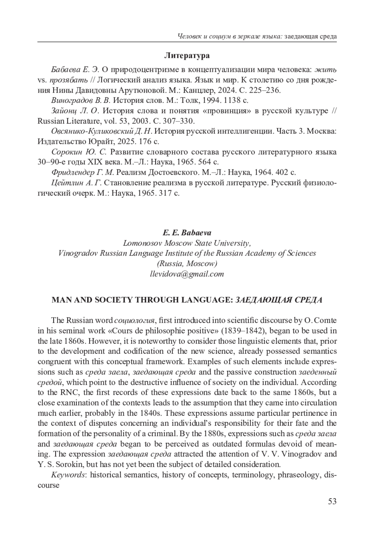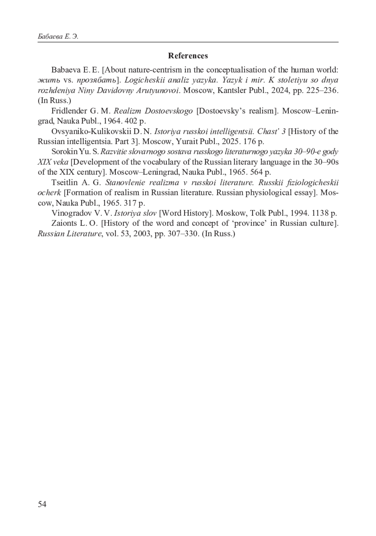 17. Бабаева Е. Э. О природоцентризме в концептуализации мира человека: жить vs. прозябать // Логический анализ языка. Язык и мир. К столетию со дня рождения Нины Давидовны Арутюновой. М.: Канцлер, 2024. С. 225-236.