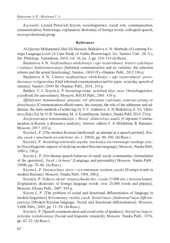 1. Аль Каззаз Мохаммед Абд Али Хуссейн, Байкулова А. Н. Методика изучения иноязычной лексики (на материале арабских заимствований) // Изв. Сарат. ун-та. Нов. сер. Сер. Филология. Журналистика. 2019. Т. 19, вып. 3. С. 310-314.