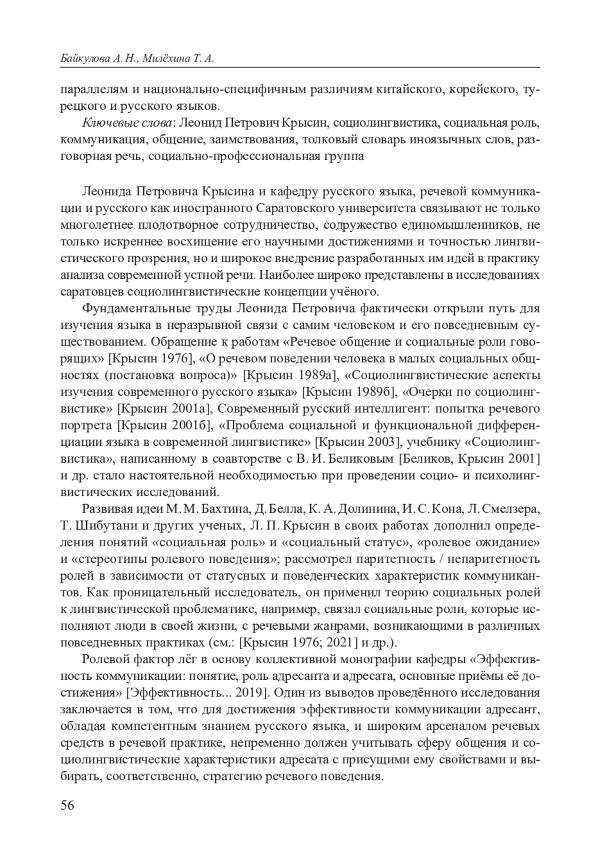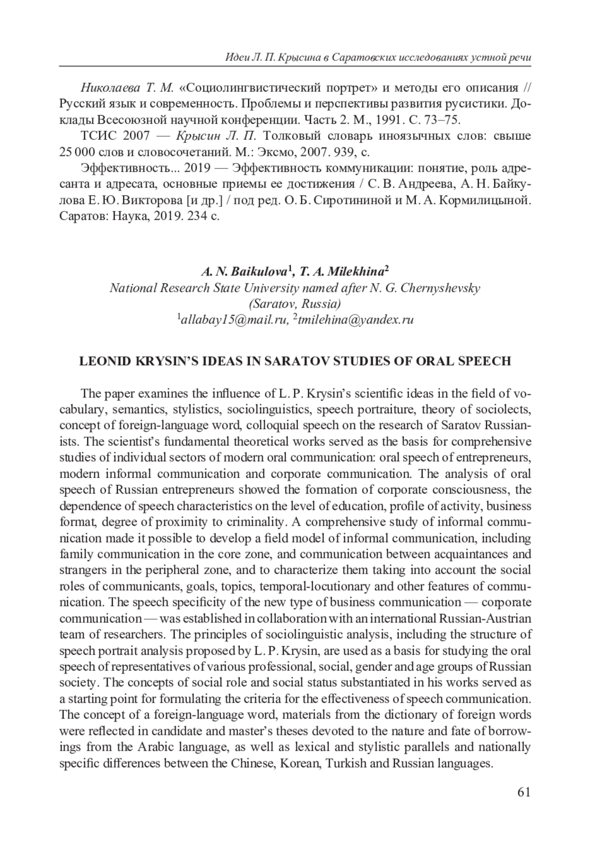 Леонида Петровича Крысина и кафедру русского языка, речевой коммуникации и русского как иностранного Саратовского университета связывают не только многолетнее плодотворное сотрудничество, содружество единомышленников, не только искреннее восхищение его научными достижениями и точностью лингвистического прозрения, но и широкое внедрение разработанных им идей в практику анализа современной устной речи. Наиболее широко представлены в исследованиях саратовцев социолингвистические концепции учёного