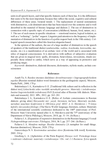 21. Свешникова Н. В. Деминутивы и контекст. На материале русских народных говоров. // Филология. Научн.сб., посвященный памяти А.М.Богомолова. Изд. Саратовского ун-та. 1996, С.117-121. EDN: OVLLAR