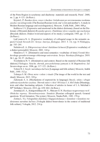 19. Куликова И. С. Экспрессивное и эмоциональное в диалектном словаре (на материале Словаря брянских говоров // Брянские говоры. Диалектное слово и аспекты его изучения. Л., 1985. С. 12-21.