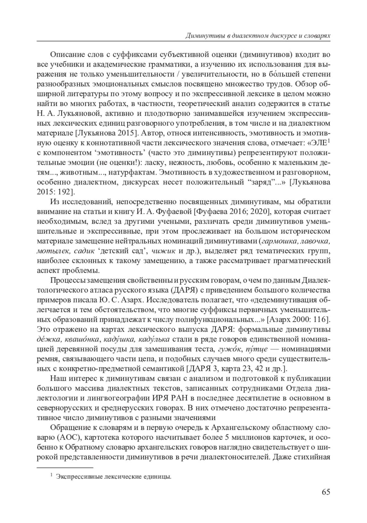 Описание слов с суффиксами субъективной оценки (диминутивов) входит во все учебники и академические грамматики, а изучению их использования для выражения не только уменьшительности / увеличительности, но в бо́льшей степени разнообразных эмоциональных смыслов посвящено множество трудов. Обзор обширной литературы по этому вопросу и по экспрессивной лексике в целом можно найти во многих работах, в частности, теоретический анализ содержится в статье Н. А. Лукьяновой, активно и плодотворно занимавшейся изучением экспрессивных лексических единиц разговорного употребления, в том числе и на диалектном материале [Лукьянова 2015]. Автор, относя интенсивность, эмотивность и эмотивную оценку к коннотативной части лексического значения слова, отмечает: «ЭЛЕ1 с компонентом ‘эмотивность’ (часто это диминутивы) репрезентируют положительные эмоции (не оценки!): ласку, нежность, любовь, особенно к маленьким детям…, животным…, натурфактам. Эмотивность в художественном и разговорном, особенно диалектном, дискурсах несет положительный “заряд”…» [Лукьянова 2015: 192].