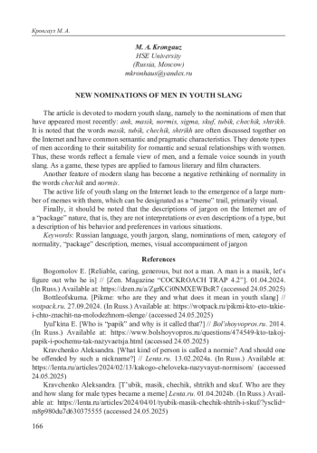 В статье рассматривается современный молодежный сленг, а именно номинации мужчин, появившиеся в самое последнее время: анк(л), масик, нормис, сигма, скуф, тюбик, чечик, штрих. Обращается внимание на то, что слова масик, тюбик, чечик, штрих часто в интернете обсуждаются вместе и имеют общие семантические и прагматические характеристики. Они обозначают типажи мужчин в соответствии с их пригодностью к романтическим и сексуальным отношениям с женщинами. Таким образом, эти слова отражают женский взгляд на мужчин, а в молодежном сленге звучит женский голос. В качестве игры эти типажи применяются к известным литературным и киноперсонажам. Другой особенностью современного сленга стало негативное переосмысление нормальности в словах чечик и нормис. Активное бытование молодежного сленга в интернете приводит к появлению большого количества мемов c ними, что можно обозначить как «мемный» — в первую очередь визуальный — шлейф. Наконец, следует отметить, что описания жаргонизмов в интернете носят «пакетный» характер, то есть это не толкования и даже не описания типажа, а описание его поведения и пристрастий в различных ситуациях