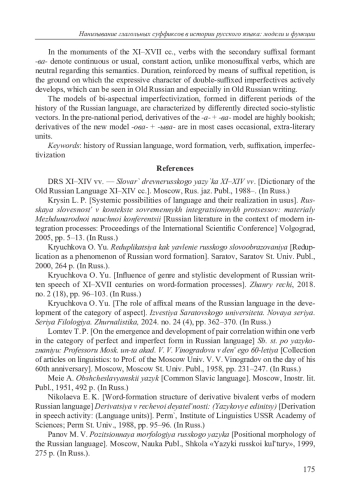 Нанизывание глагольных суффиксов, развивающееся в разные периоды истории русского языка, участвует в процессах формирования видовых отношений в системе русского глагола. В донациональный период определенное развитие получает модель суффиксального нанизывания -а- + -ва-, начиная с XIX в. — модель -ова- + -ыва-. В обоих случаях суффиксальное удвоение поддерживает имперфективное значение глагола, не вполне четко выраженное в односуффиксном глаголе, являющимся нередко двувидовым. Однако модели суффиксального нанизывания не становятся ни в один из исторических периодов продуктивными средствами видообразования, эксплицируя лишь значимые тенденции в этой области. В памятниках XI–XVII вв. глаголы с вторичным суффиксальным формантом -ва- обозначали длящееся или обычное, постоянное действие в отличие от односуффиксных глаголов, нейтральных в отношении данной семантики. Продолжительность, усиленная посредством суффиксального повтора, является почвой, на которой активно развивается экспрессивизация двусуффиксных имперфективов, отраженная в древнерусской и особенно в старорусской письменности. Модели двусуффиксной имперфективации, формирующиеся в разные периоды истории русского языка, характеризуются разнонаправленными социо-стилистическими векторами. В донациональный период производные модели -а- + -ва- входят в систему средств высокой книжности; дериваты новой модели -ова- + -ываявляются в большинстве случаев окказиональными, внелитературными единицами