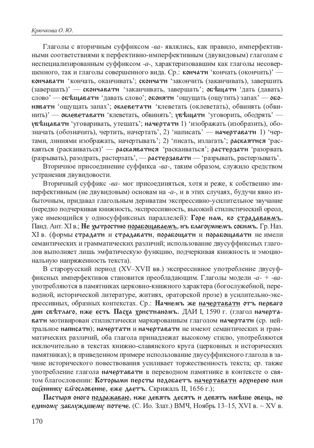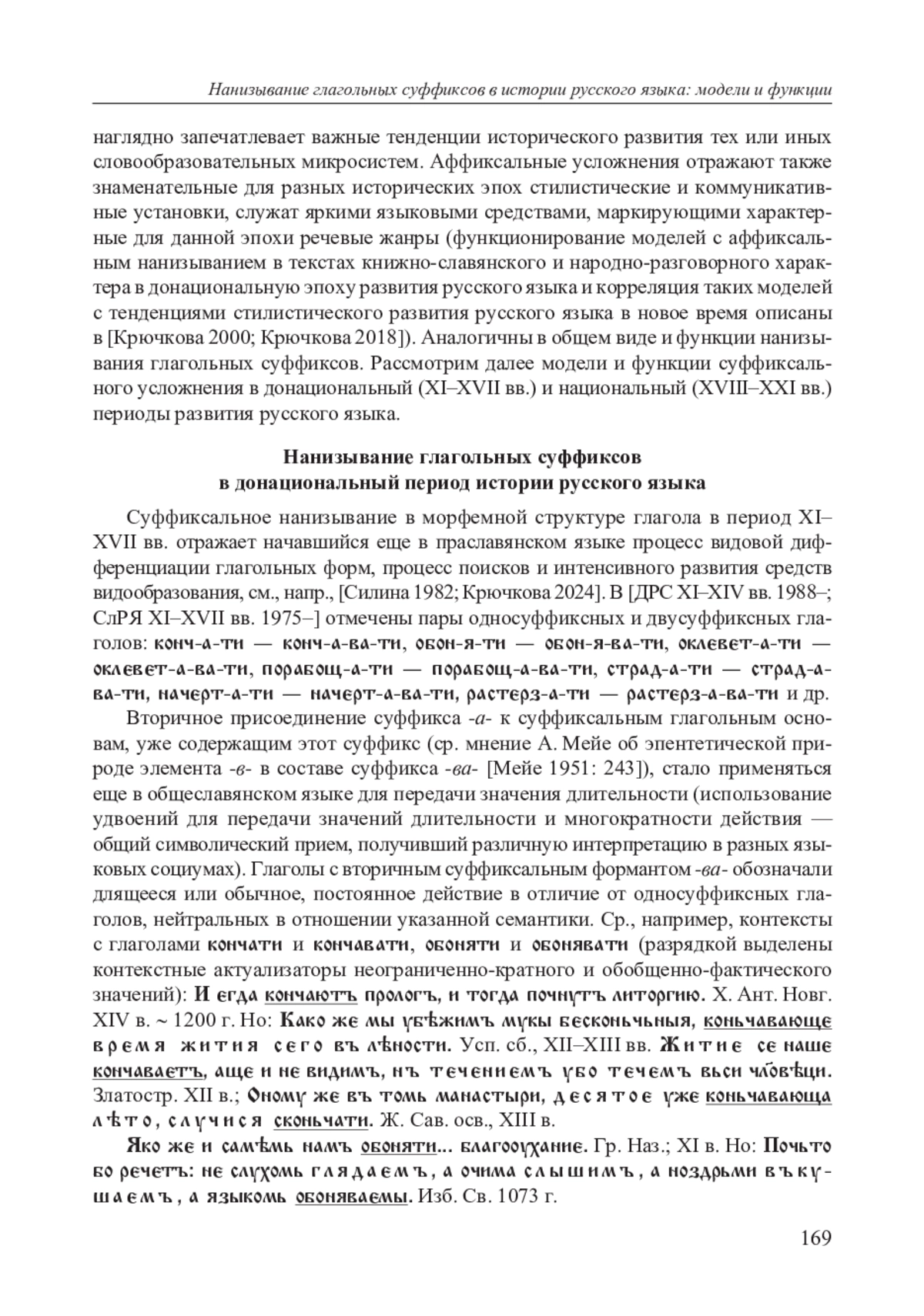 Нанизывание словообразовательных аффиксов (последовательное присоединение одних и тех же или синонимических аффиксов), встречающееся в структуре русских слов разных частей речи на всем протяжении развития русского языка, 169 наглядно запечатлевает важные тенденции исторического развития тех или иных словообразовательных микросистем. Аффиксальные усложнения отражают также знаменательные для разных исторических эпох стилистические и коммуникативные установки, служат яркими языковыми средствами, маркирующими характерные для данной эпохи речевые жанры (функционирование моделей с аффиксальным нанизыванием в текстах книжно-славянского и народно-разговорного характера в донациональную эпоху развития русского языка и корреляция таких моделей с тенденциями стилистического развития русского языка в новое время описаны в [Крючкова 2000; Крючкова 2018]). Аналогичны в общем виде и функции нанизывания глагольных суффиксов. Рассмотрим далее модели и функции суффиксального усложнения в донациональный (XI–XVII вв.) и национальный (XVIII–XXI вв.) периоды развития русского языка.