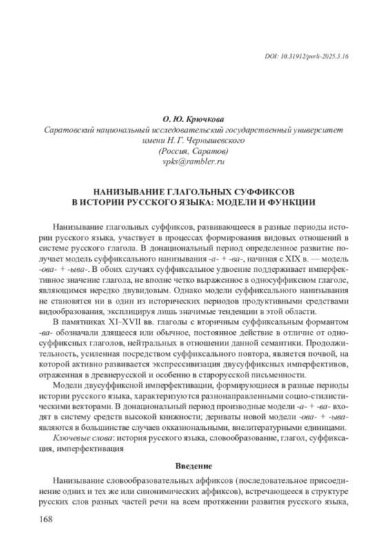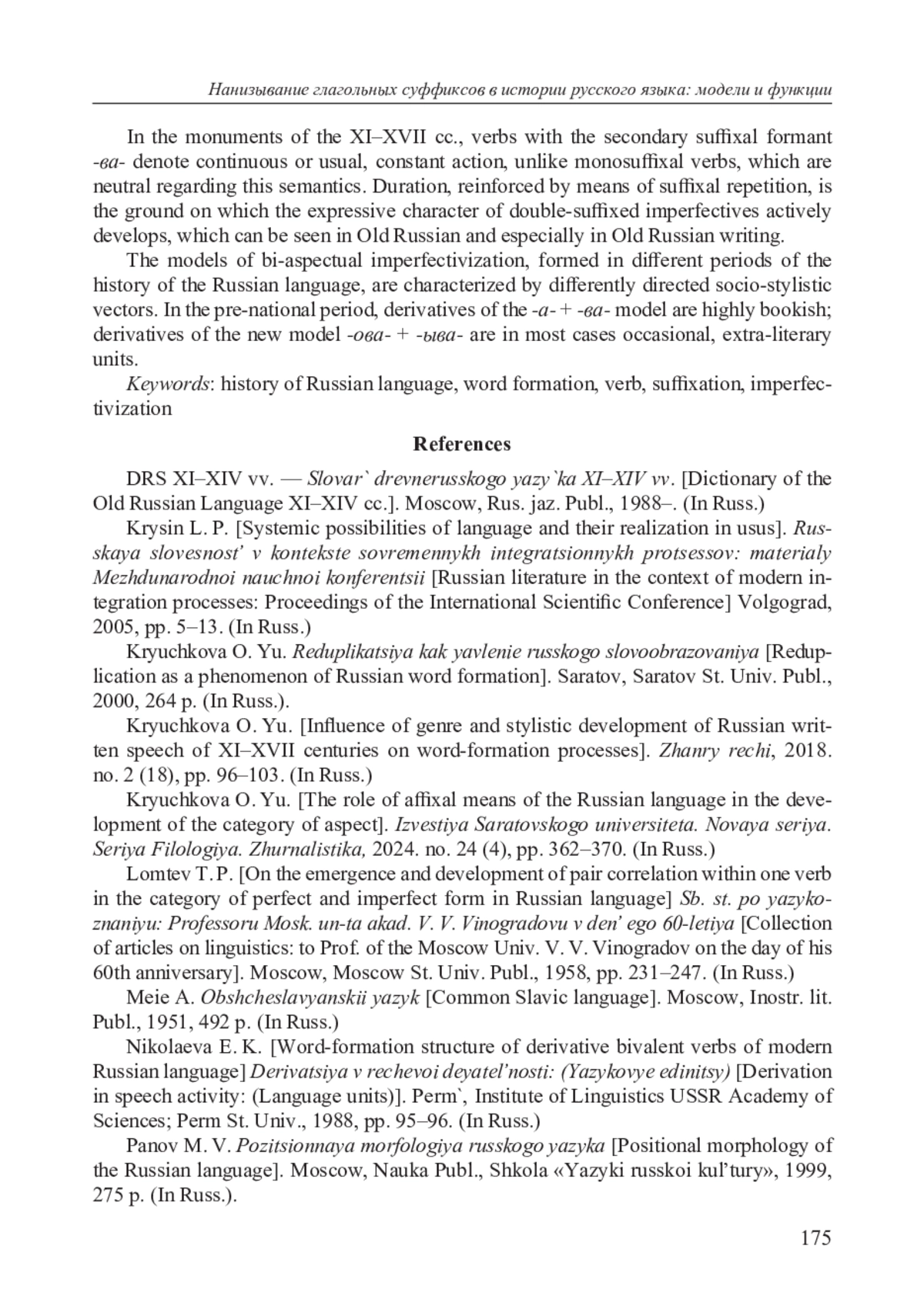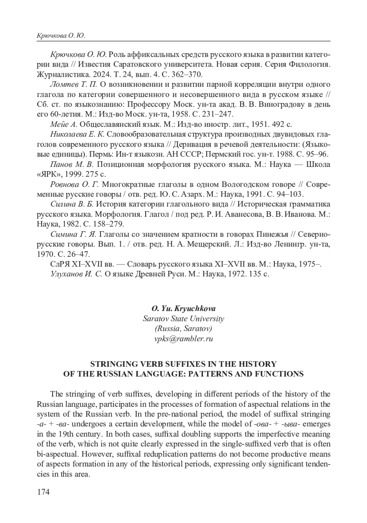 5. Крючкова О. Ю. Роль аффиксальных средств русского языка в развитии категории вида // Известия Саратовского университета. Новая серия. Серия Филология. Журналистика. 2024. Т. 24, вып. 4. С. 362-370. EDN: CIEFFD