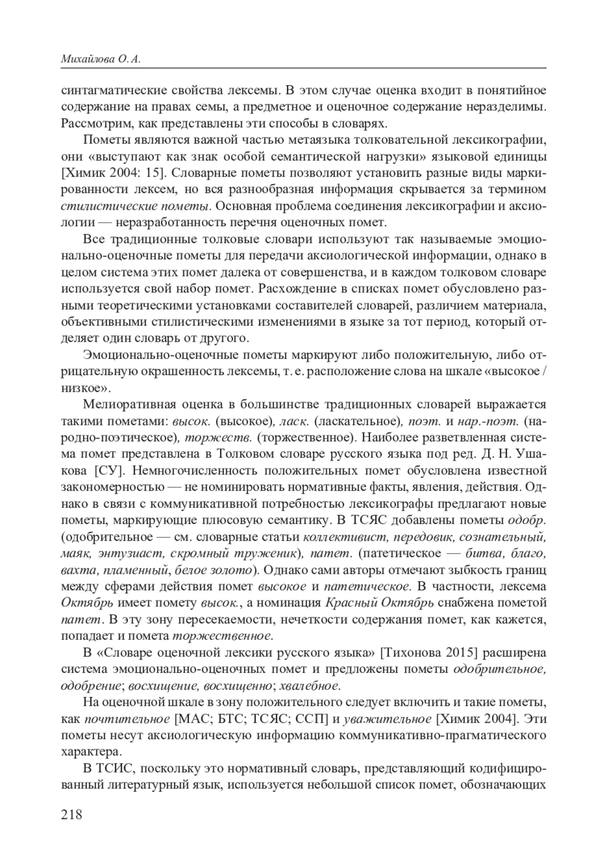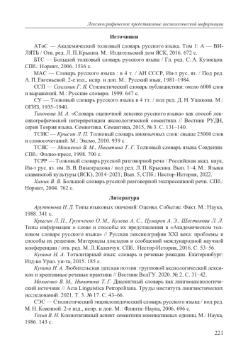 6. Тихонова М. А. “Словарь оценочной лексики русского языка” как способ лексикографической интерпретации аксиологической семантики // Вестник РУДН, серия Теория языка. Семиотика. Семантика, 2015, № 3. С. 131-140.