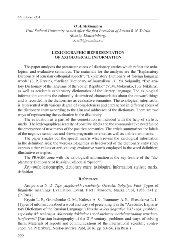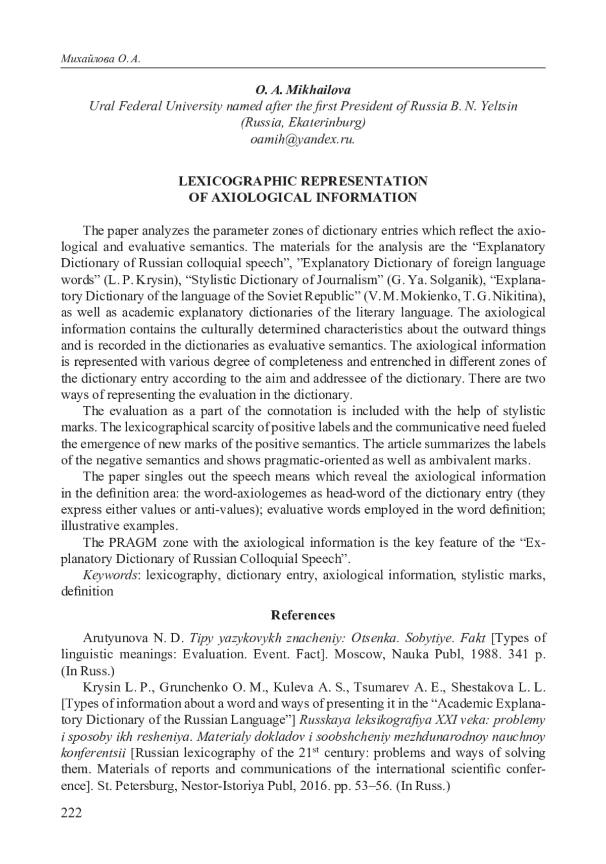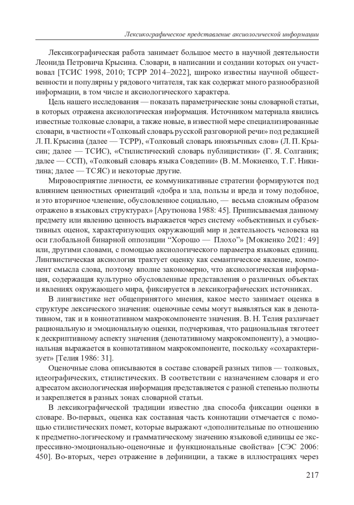 Лексикографическая работа занимает большое место в научной деятельности Леонида Петровича Крысина. Словари, в написании и создании которых он участвовал [ТСИС 1998, 2010; ТСРР 2014–2022], широко известны научной общественности и популярны у рядового читателя, так как содержат много разнообразной информации, в том числе и аксиологического характера. Цель нашего исследования — показать параметрические зоны словарной статьи, в которых отражена аксиологическая информация. Источником материала явились известные толковые словари, а также новые, в известной мере специализированные словари, в частности «Толковый словарь русской разговорной речи» под редакцией Л. П. Крысина (далее — ТСРР), «Толковый словарь иноязычных слов» (Л. П. Крысин; далее — ТСИС), «Стилистический словарь публицистики» (Г. Я. Сол ганик; далее — ССП), «Толковый словарь языка Совдепии» (В. М. Мокиенко, Т. Г. Никитина; далее — ТСЯС) и некоторые другие