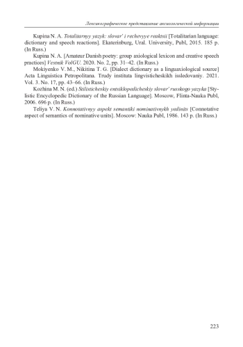 14. Купина Н. А. Любительская датская поэзия: групповой аксиологический лексикон и креативные речевые практики // Вестник ВолГУ. 2020. № 2. С. 31-42.