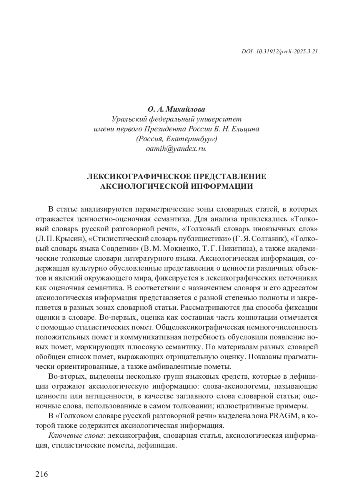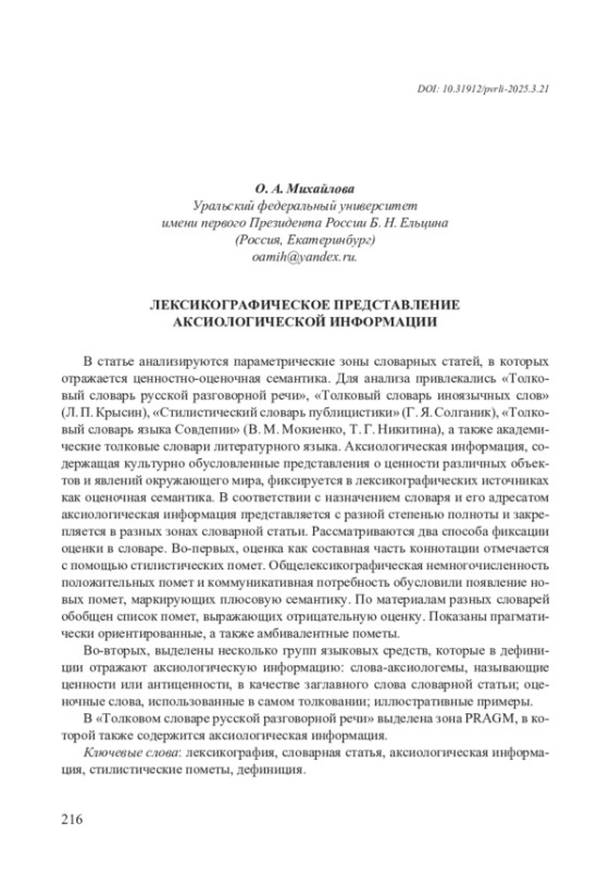 В статье анализируются параметрические зоны словарных статей, в которых отражается ценностно-оценочная семантика. Для анализа привлекались «Толковый словарь русской разговорной речи», «Толковый словарь иноязычных слов» (Л. П. Крысин), «Стилистический словарь публицистики» (Г. Я. Солганик), «Толковый словарь языка Совдепии» (В. М. Мокиенко, Т. Г. Никитина), а также академические толковые словари литературного языка. Аксиологическая информация, содержащая культурно обусловленные представления о ценности различных объектов и явлений окружающего мира, фиксируется в лексикографических источниках как оценочная семантика. В соответствии с назначением словаря и его адресатом аксиологическая информация представляется с разной степенью полноты и закрепляется в разных зонах словарной статьи. Рассматриваются два способа фиксации оценки в словаре. Во-первых, оценка как составная часть коннотации отмечается с помощью стилистических помет. Общелексикографическая немногочисленность положительных помет и коммуникативная потребность обусловили появление новых помет, маркирующих плюсовую семантику. По материалам разных словарей обобщен список помет, выражающих отрицательную оценку. Показаны прагматически ориентированные, а также амбивалентные пометы. Во-вторых, выделены несколько групп языковых средств, которые в дефиниции отражают аксиологическую информацию: слова-аксиологемы, называющие ценности или антиценности, в качестве заглавного слова словарной статьи; оценочные слова, использованные в самом толковании; иллюстративные примеры. В «Толковом словаре русской разговорной речи» выделена зона PRAGM, в которой также содержится аксиологическая информация